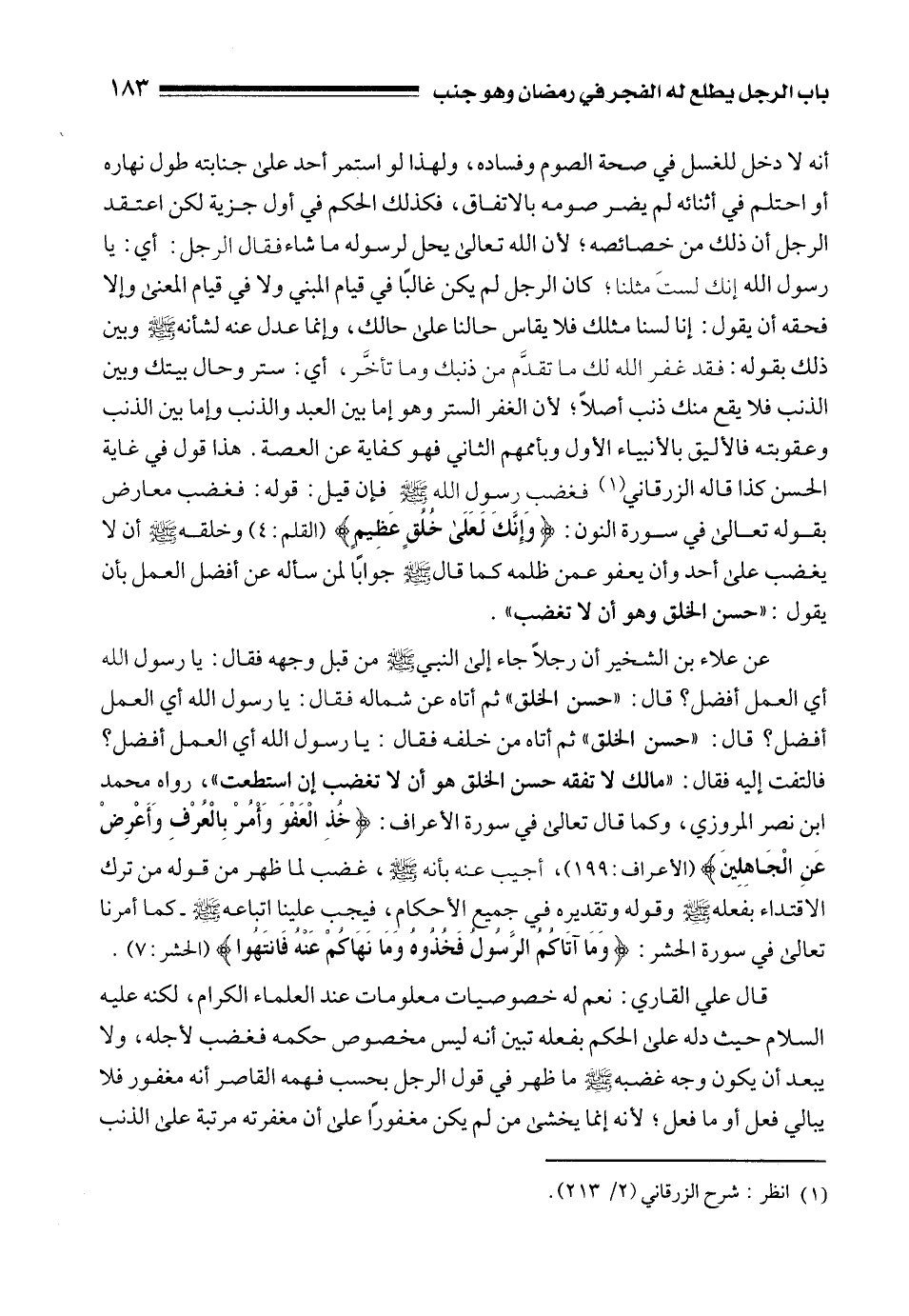 أنه لا دخل للغسل في صحة الصوم وفساده، ولهذا لو استمر أحد على جنابته طول نهاره أو احتلم في أثنائه لم يضر صومه بالاتفاق، فكذلك الحكم في أول جزية لكن اعتقد الرجل أن ذلك من خصائصه؛ لأن الله تعالى يحل لرسوله ما شاء فقال الرجل: أي: يا رسول الله إنك لستَ مثلنا؛ كان الرجل لم يكن غالبًا في قيام المبني ولا في قيام المعنى وإلا فحقه أن يقول: إنا لسنا مثلك فلا يقاس حالنا على حالك، وإنما عدل عنه لشأنه - صلى الله عليه وسلم - وبين ذلك بقوله: فقد غفر الله لك ما تقدَّم من ذنبك وما تأخَّر، أي: ستر وحال بيتك وبين الذنب فلا يقع منك ذنب أصلًا؛ لأن الغفر الستر وهو إما بين العبد والذنب وإما بين الذنب وعقوبته فالأليق بالأنبياء الأول وبأممهم الثاني فهو كفاية عن العصة. هذا قول في غاية الحسن كذا قاله الزرقاني (¬1) فغضب رسول الله - صلى الله عليه وسلم - فإن قيل: قوله: فغضب معارض بقوله تعالى في سورة النون: {وَإِنَّكَ لَعَلَى خُلُقٍ عَظِيمٍ} [القلم: 4] وخلقه - صلى الله عليه وسلم - أن لا يغضب على أحد وأن يعفو عمن ظلمه كما قال - صلى الله عليه وسلم - جوابًا لمن سأله عن أفضل العمل بأن يقول: "حسن الخلق وهو أن لا تغضب".