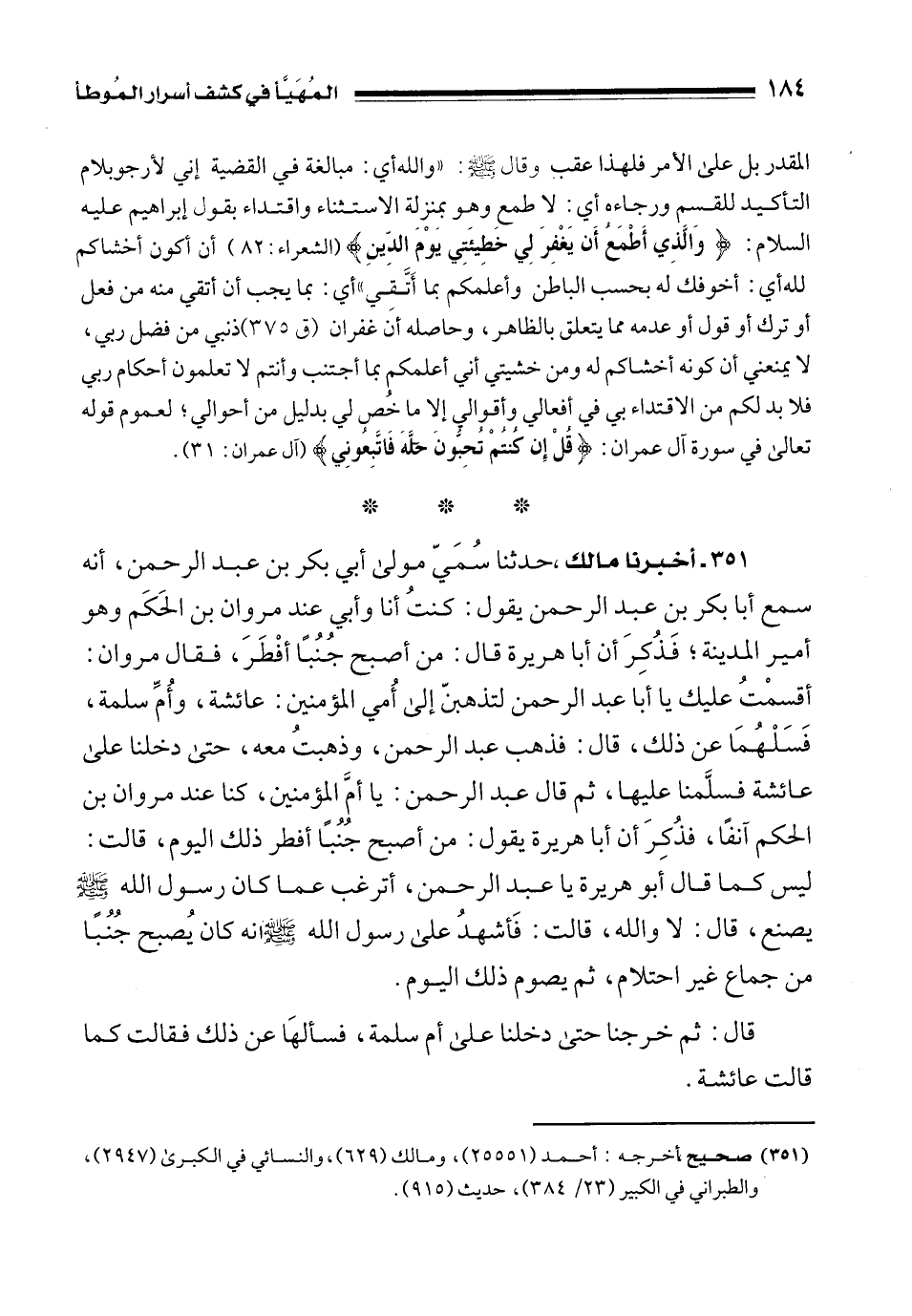 351 - أخبرنا مالك، حدثنا سُمَيّ مولى أبي بكر بن عبد الرحمن، أنه سمع أبا بكر بن عبد الرحمن يقول: كنتُ أنا وأبي عند مروان بن الحَكَم وهو أمير المدينة؛ فَذُكِرَ أن أبا هريرة قال: من أصبح جُنُبًا أفْطَرَ، فقال مروان: أقسمْتُ عليك يا أبا عبد الرحمن لتذهبنّ إلى أُمي المؤمنين: عائشة، وأُمِّ سلمة، فَسَلْهُمَا عن ذلك، قال: فذهب عبد الرحمن، وذهبتُ معه، حتى دخلنا على عائشة فسلَّمنا عليها، ثم قال عبد الرحمن: يا أمَّ المؤمنين، كنا عند مروان بن الحكم آنفًا، فذُكِرَ أن أبا هريرة يقول: من أصبح جُنُبًا أفطر ذلك اليوم، قالت: ليس كما قال أبو هريرة يا عبد الرحمن، أترغب عما كان رسول الله - صلى الله عليه وسلم - يصنع، قال: لا والله، قالت: فَأشهدُ على رسول الله - صلى الله عليه وسلم - أنه كان يُصبح جُنُبًا من جماع غير احتلام، ثم يصوم ذلك اليوم.