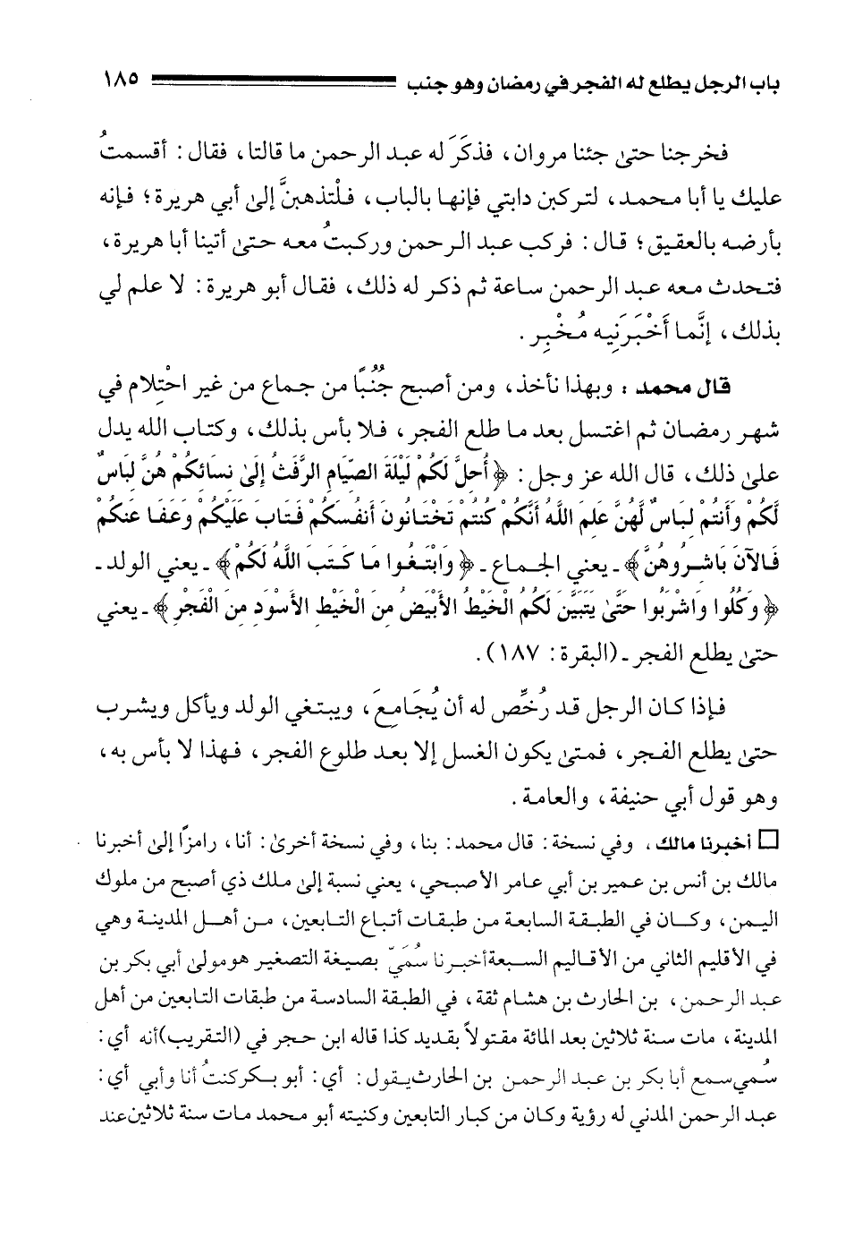 قال محمد: وبهذا نأخذ، ومن أصبح جُنُبًا من جماع من غير احْتِلام في شهر رمضان ثم اغتسل بعد ما طلع الفجر، فلا بأس بذلك، وكتاب الله يدل على ذلك، قال الله عز وجل: {أُحِلَّ لَكُمْ لَيْلَةَ الصِّيَامِ الرَّفَثُ إِلَى نِسَائِكُمْ هُنَّ لِبَاسٌ لَكُمْ وَأَنْتُمْ لِبَاسٌ لَهُنَّ عَلِمَ اللَّهُ أَنَّكُمْ كُنْتُمْ تَخْتَانُونَ أَنْفُسَكُمْ فَتَابَ عَلَيْكُمْ وَعَفَا عَنْكُمْ فَالْآنَ بَاشِرُوهُنَّ} - يعني الجماع - {وَابْتَغُوا مَا كَتَبَ اللَّهُ لَكُمْ} - يعني الولد - {وَكُلُوا وَاشْرَبُوا حَتَّى يَتَبَيَّنَ لَكُمُ الْخَيْطُ الْأَبْيَضُ مِنَ الْخَيْطِ الْأَسْوَدِ مِنَ الْفَجْرِ} - يعني حتى يطلع الفجر -[البقرة: 187].