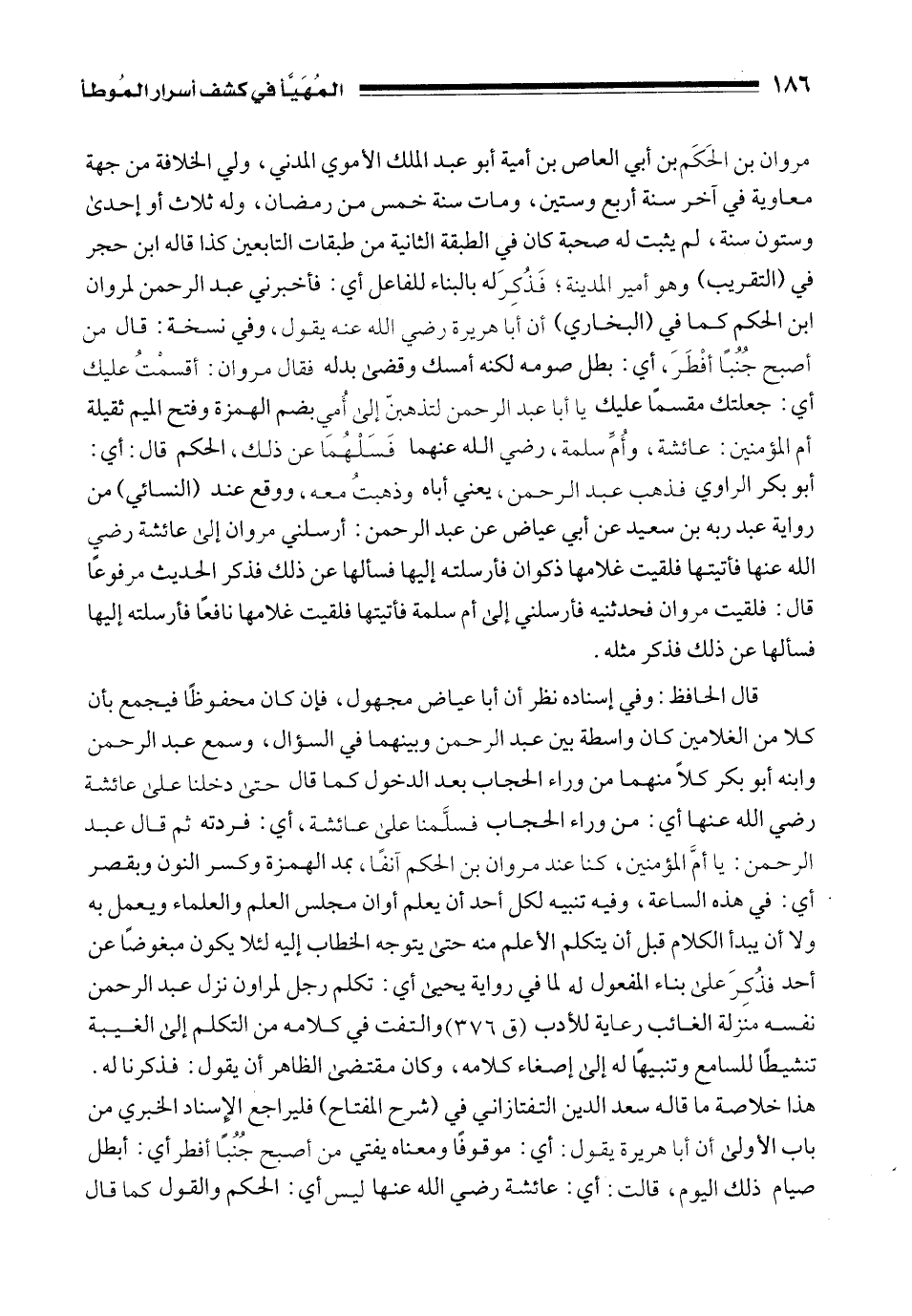 قال الحافظ: وفي إسناده نظر أن أبا عياض مجهول، فإن كان محفوظًا فيجمع بأن كلا من الغلامين كان واسطة بين عبد الرحمن وبينهما في السؤال، وسمع عبد الرحمن وابنه أبو بكر كلًا منهما من وراء الحجاب بعد الدخول كما قال حتى دخلنا على عائشة رضي الله عنها أي: من وراء الحجاب فسلَّمنا على عائشة، أي: فردته ثم قال عبد الرحمن: يا أمَّ المؤمنين، كنا عند مروان بن الحكم آنفًا، بمد الهمزة وكسر النون وبقصر أي: في هذه الساعة، وفيه تنبيه لكل أحد أن يعلم أوان مجلس العلم والعلماء ويعمل به ولا أن يبدأ الكلام قبل أن يتكلم الأعلم منه حتى يتوجه الخطاب إليه لئلا يكون مبغوضًا عن أحد فذُكِرَ على بناء المفعول له لما في رواية يحيى أي: تكلم رجل لمروان نزل عبد الرحمن نفسه منزلة الغائب رعاية للأدب (ق 376) والتفت في كلامه من التكلم إلى الغيبة تنشيطًا للسامع وتنبيهًا له إلى إصغاء كلامه، وكان مقتضى الظاهر أن يقول: فذكرنا له. هذا خلاصة ما قاله سعد الدين التفتازاني في (شرح المفتاح) فليراجع الإِسناد الخبري من باب الأولى أن أبا هريرة يقول: أي: موقوفًا ومعناه يفتي من أصبح جُنُبًا أفطر أي: أبطل صيام ذلك اليوم، قالت: أي: عائشة رضي الله عنها ليس أي: الحكم والقول كما قال