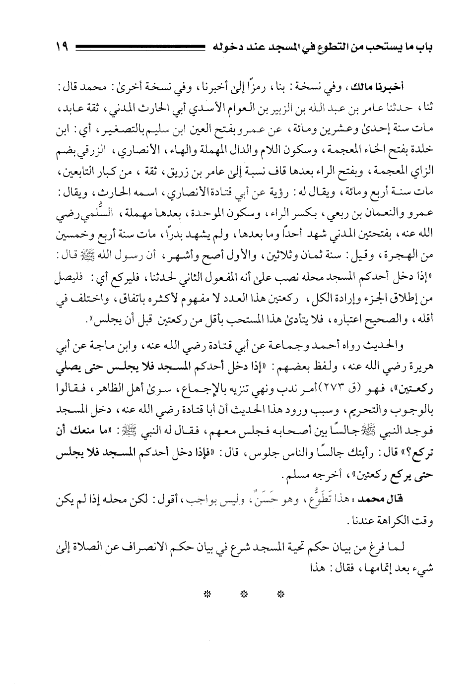أخبرنا مالك، وفي نسخة: بنا، رمزًا إلى أخبرنا، وفي نسخة أخرى: محمد قال: ثنا، حدثنا عامر بن عبد الله بن الزبير بن العوام الأسدي أبي الحارث المدني، ثقة عابد، مات سنة إحدى وعشرين ومائة، عن عمرو بفتح العين ابن سليم بالتصغير، أي: ابن خلدة بفتح الخاء المعجمة، وسكون اللام والدال المهملة والهاء، الأنصاري، الزرقي بضم الزاي المعجمة، وبفتح الراء بعدها قاف نسبة إلى عامر بن زريق، ثقة، من كبار التابعين، مات سنة أربع ومائة، ويقال له: رؤية عن أبي قتادة الأنصاري، اسمه الحارث، ويقال: عمرو والنعمان بن ربعي، بكسر الراء، وسكون الموحدة، بعدها مهملة، السُّلمي رضي الله عنه، بفتحتين المدني شهد أحدًا وما بعدها، ولم يشهد بدرًا، مات سنة أربع وخمسين من الهجرة، وقيل: سنة ثمان وثلاثين، والأول أصح وأشهر، أن رسول الله - صلى الله عليه وسلم - قال: "إذا دخل أحدكم المسجد محله نصب على أنه المفعول الثاني لحدثنا، فليركع أي: فليصل من إطلاق الجزء وإرادة الكل، ركعتين هذا العدد لا مفهوم لأكثره باتفاق، واختلف في أقله، والصحيح اعتباره، فلا يتأدى هذا المستحب بأقل من ركعتين قبل أن يجلس".