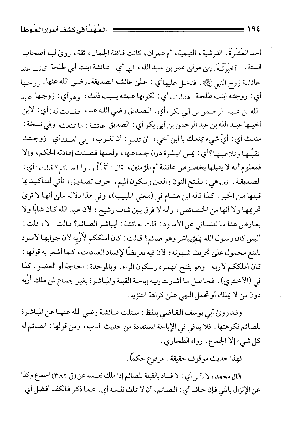 وقد روى أبي يوسف القاضي بلفظ: سئلت عائشة رضي الله عنها عن المباشرة للصائم فكرهتها. فلا ينافي في الإِباحة المستفادة من حديث الباب، ومن قولها: الصائم له كل شيء إلا الجماع. رواه الطحاوي.