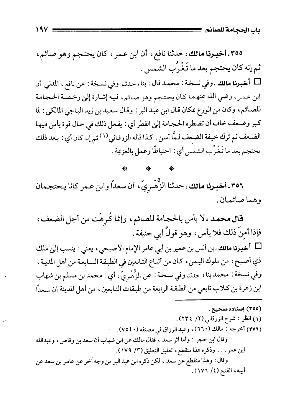 356 - أخبرنا مالك، حدثنا الزُّهْرِيّ، أن سعدًا وابن عمر كانا يحتجمان وهما صائمان.