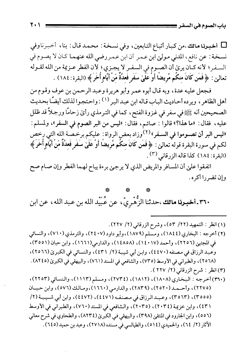 • أخبرنا مالك، من كبار أتباع التابعين، وفي نسخة: محمد قال: بنا، أخبرنا وفي نسخة: عن نافع، المدني مولى ابن عمر أن ابن عمر رضي الله عنهما كان لا يصوم في السفر؛ لأنه كان يرى أن الصوم في السفر لا يجزي؛ لأن الفطر عزيمة من الله لقوله تعالى: {فَمَنْ كَانَ مِنْكُمْ مَرِيضًا أَوْ عَلَى سَفَرٍ فَعِدَّةٌ مِنْ أَيَّامٍ أُخَرَ} [البقرة: 184].