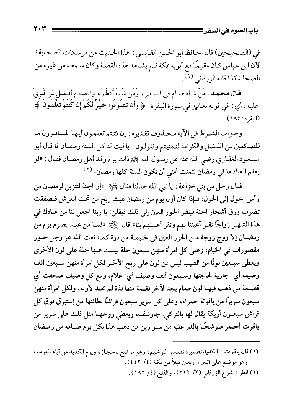 قال محمد: مَنْ شاء صام في السفر، وَمَن شَاءَ أَفْطَرَ، والصوم أفضل لمن قَوِيَ عليه، أي: في قوله تعالى في سورة البقرة: {وَأَنْ تَصُومُوا خَيْرٌ لَكُمْ إِنْ كُنْتُمْ تَعْلَمُونَ} [البقرة: 184].