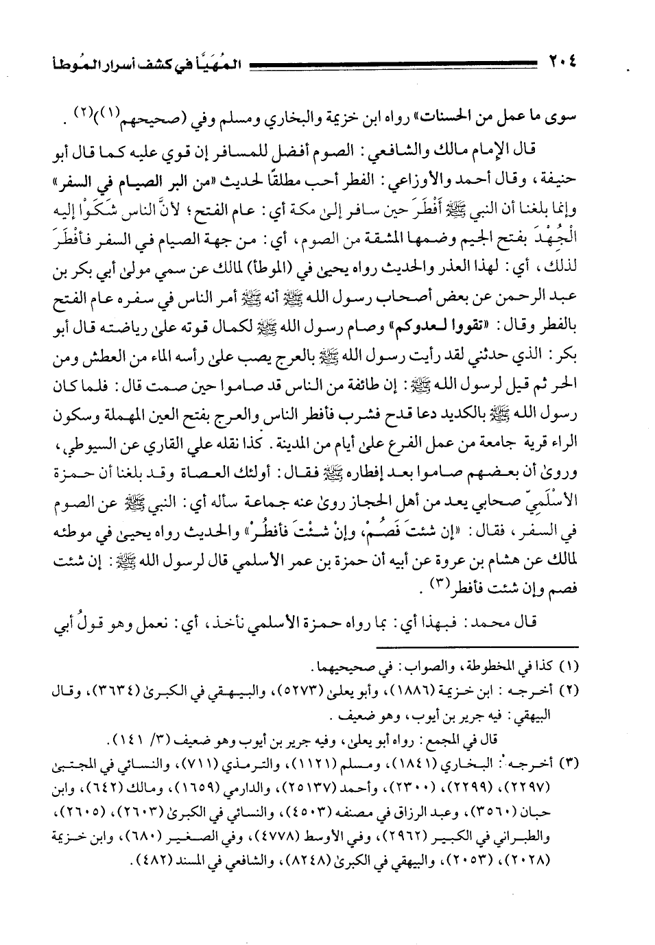 قال الإِمام مالك والشافعي: الصوم أفضل للمسافر إن قوي عليه كما قال أبو حنيفة، وقال أحمد والأوزاعي: الفطر أحب مطلقًا لحديث "من البر الصيام في السفر" وإنما بلغنا أن النبي - صلى الله عليه وسلم - أَفْطَرَ حين سافر إلى مكة أي: عام الفتح؛ لأنَّ الناس شَكَوا إليهِ الْجُهْدَ بفتح الجيم وضمها المشقة من الصوم، أي: من جهة الصيام في السفر فأفْطَرَ لذلك، أي: لهذا العذر والحديث رواه يحيى في (الموطأ) لمالك عن سمي مولى أبي بكر بن عبد الرحمن عن بعض أصحاب رسول الله - صلى الله عليه وسلم - أنه - صلى الله عليه وسلم - أمر الناس في سفره عام الفتح بالفطر وقال: "تقووا لعدوكم" وصام رسول الله - صلى الله عليه وسلم - لكمال قوته على رياضته قال أبو بكر: الذي حدثني لقد رأيت رسول الله - صلى الله عليه وسلم - بالعرج يصب على رأسه الماء من العطش ومن الحر ثم قيل لرسول الله - صلى الله عليه وسلم -: إن طائفة من الناس قد صاموا حين صمت قال: فلما كان رسول الله - صلى الله عليه وسلم - بالكديد دعا قدح فشرب فأفطر الناس والعرج بفتح العين المهملة وسكون الراء قرية جامعة من عمل الفرع على أيام من المدينة. كذا نقله علي القاري عن السيوطي، وروى أن بعضهم صاموا بعد إفطاره - صلى الله عليه وسلم - فقال: أولئك العصاة وقد بلغنا أن حمزة الأسْلَمِيّ صحابي يعد من أهل الحجاز روى عنه جماعة سأله أي: النبي - صلى الله عليه وسلم - عن الصوم في السفر، فقال: "إن شئتَ فَصُمْ، وإنْ شئْتَ فأفطُرْ" والحديث رواه يحيى في موطئه لمالك عن هشام بن عروة عن أبيه أن حمزة بن عمر الأسلمي قال لرسول الله - صلى الله عليه وسلم -: إن شئت فصم وإن شئت فأفطر (¬3).