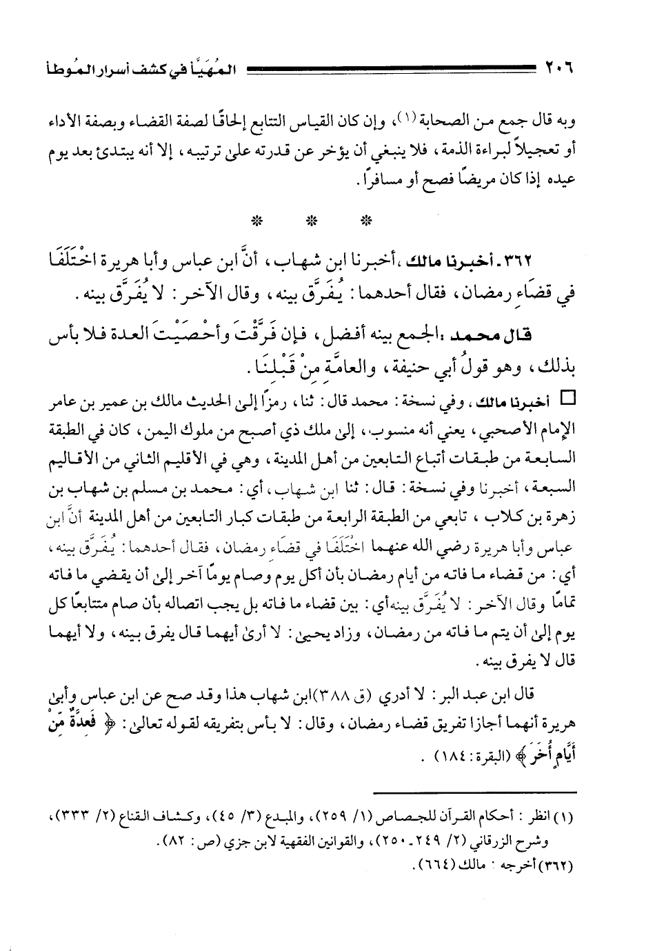 • أخبرنا مالك، وفي نسخة: محمد قال: ثنا، رمزًا إلى الحديث مالك بن عمير بن عامر الإِمام الأصبحي، يعني أنه منسوب، إلى ملك ذي أصبح من ملوك اليمن، كان في الطبقة السابعة من طبقات أتباع التابعين من أهل المدينة، وهي في الإقليم الثاني من الأقاليم السبعة، أخبرنا وفي نسخة: قال: ثنا ابن شهاب، أي: محمد بن مسلم بن شهاب بن زهرة بن كلاب، تابعي من الطبقة الرابعة من طبقات كبار التابعين من أهل المدينة أنَّ أبن عباس وأبا هريرة رضي الله عنهما اخْتَلَفَا في قضَاء رمضان، فقال أحدهما: يُفَرَّق بينه، أي: من قضاء ما فاته من أيام رمضان بأن أكل يوم وصام يومًا آخر إلى أن يقضي ما فاته تمامًا وقال الآخر: لا يُفَرَّق بينه أي: بين قضاء ما فاته بل يجب اتصاله بأن صام متتابعًا كل يوم إلى أن يتم ما فاته من رمضان، وزاد يحيى: لا أرى أيهما قال يفرق بينه، ولا أيهما قال لا يفرق بينه.