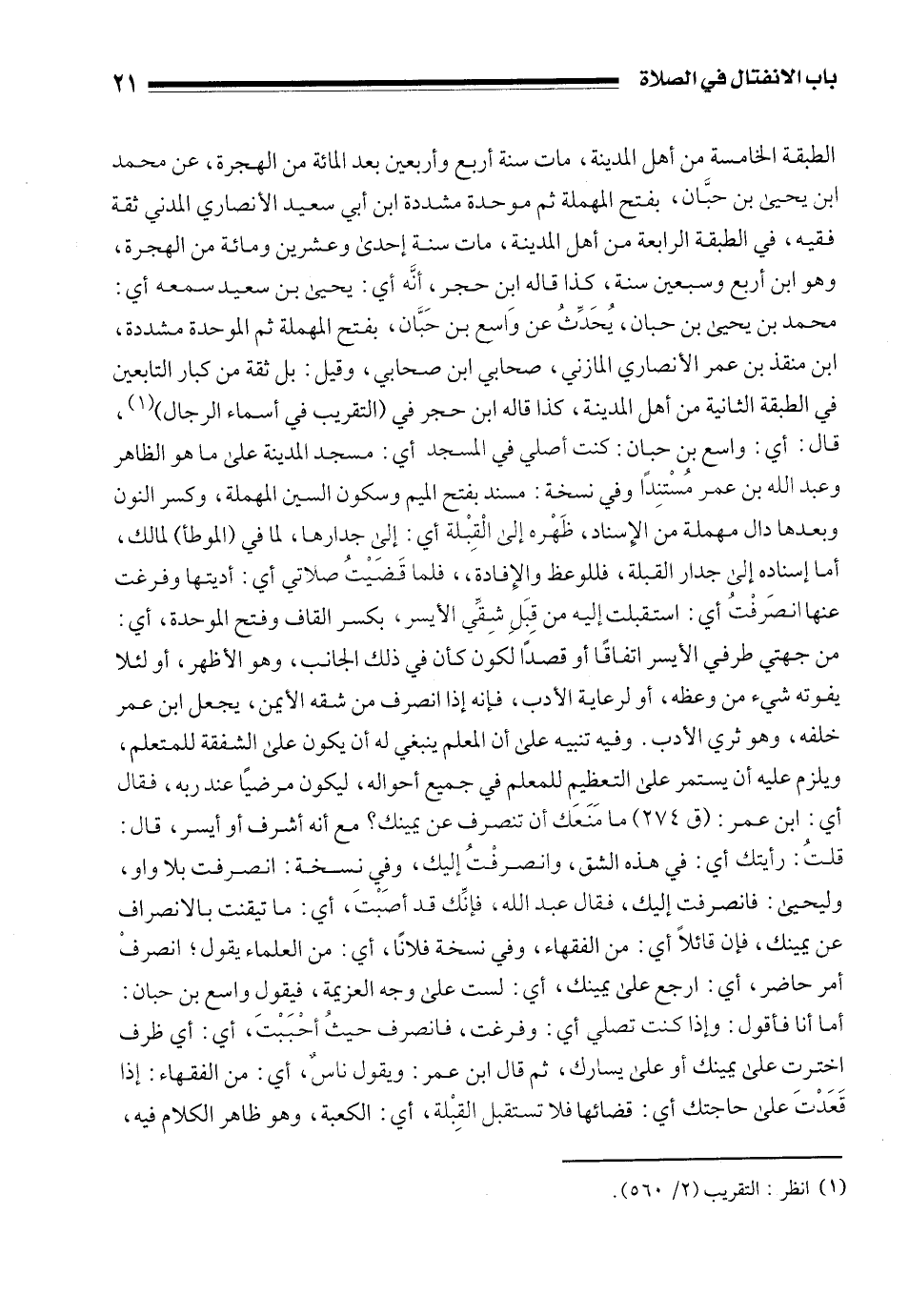 الطبقة الخامسة من أهل المدينة، مات سنة أربع وأربعين بعد المائة من الهجرة، عن محمد بن يحيى بن حبَّان، بفتح المهملة ثم موحدة مشددة ابن أبي سعيد الأنصاري المدني ثقة فقيه، في الطبقة الرابعة من أهل المدينة، مات سنة إحدى وعشرين ومائة من الهجرة، وهو ابن أربع وسبعين سنة، كذا قاله ابن حجر، أنَّه أي: يحيى بن سعيد سمعه أي: محمد بن يحيى بن حبان، يُحَدِّثُ عن وَاسع بن حَبَّان، بفتح المهملة ثم الموحدة مشددة، ابن منقذ بن عمر الأنصاري المازني، صحابي ابن صحابي، وقيل: بل ثقة من كبار التابعين في الطبقة الثانية من أهل المدينة، كذا قاله ابن حجر في (التقريب في أسماء الرجال) (¬1)، قال: أي: واسع بن حبان: كنت أصلي في المسجد أي: مسجد المدينة على ما هو الظاهر وعبد الله بن عمر مُسْتنِدًا وفي نسخة: مسند بفتح الميم وسكون السين المهملة، وكسر النون وبعدها دال مهملة من الإِسناد، ظَهْره إلى القِبْلة أي: إلى جدارها، لما في (الموطأ) لمالك، أما إسناده إلى جدار القبلة، فللوعظ والإِفادة، فلما قَضَيْتُ صلاتي أي: أديتها وفرغت عنها انصَرفْتُ أي: استقبلت إليه من قِبَلِ شِقِّي الأيسر، بكسر القاف وفتح الموحدة، أي: من جهتي طرفي الأيسر اتفاقًا أو قصدًا لكون كأن في ذلك الجانب، وهو الأظهر، أو لئلا يفوته شيء من وعظه، أو لرعاية الأدب، فإنه إذا انصرف من شقه الأيمن، يجعل ابن عمر خلفه، وهو ثري الأدب. وفيه تنبيه على أن المعلم ينبغي له أن يكون على الشفقة للمتعلم، ويلزم عليه أن يستمر على التعظيم للمعلم في جميع أحواله، ليكون مرضيًا عند ربه، فقال أي: ابن عمر: (ق 274) ما مَنَعَك أن تنصرف عن يمينك؟ مع أنه أشرف أو أيسر، قال: قلتُ: رأيتك أي: في هذه الشق، وانصرفْتُ إليك، وفي نسخة: انصرفت بلا واو، وليحيى: فانصرفت إليك، فقال عبد الله، فإنَّك قد أصَبْتَ، أي: ما تيقنت بالانصراف عن يمينك، فإن قائلًا أي: من الفقهاء، وفي نسخة فلانًا، أي: من العلماء يقول؛ انصرفْ أمر حاضر، أي: ارجع على يمينك، أي: لست على وجه العزيمة، فيقول واسع بن حبان: أما أنا فأقول: وإذا كنت تصلي أي: وفرغت، فانصرف حيثُ أحْبَبْتَ، أي: أي ظرف اخترت على يمينك أو على يسارك، ثم قال ابن عمر: ويقول ناسٌ، أي: من الفقهاء: إذا قَعَدْتَ على حاجتك أي: قضائها فلا تستقبل القِبْلة، أي: الكعبة، وهو ظاهر الكلام فيه،