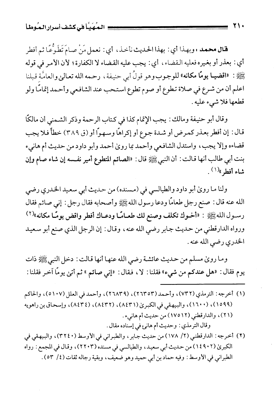 قال محمد: وبهذا أي: بهذا الحديث نأخذ، أي: نعمل مَن صامَ تَطَوُّعًا ثم أفطر أي: بعذر أو بغيره فعليه القضاء، أي: يجب عليه القضاء لا الكفارة؛ لأن الأمر في قوله - صلى الله عليه وسلم -: "اقضيا يومًا مكانه" للوجوب وهو قولُ أبي حنيفة، رحمه الله تعالى والعامَّة قبلنا اعلم أن من شرع في صلاة تطوع أو صوم تطوع استحب عند الشافعي وأحمد إتمامًا ولو قطعها فلا شيء عليه.