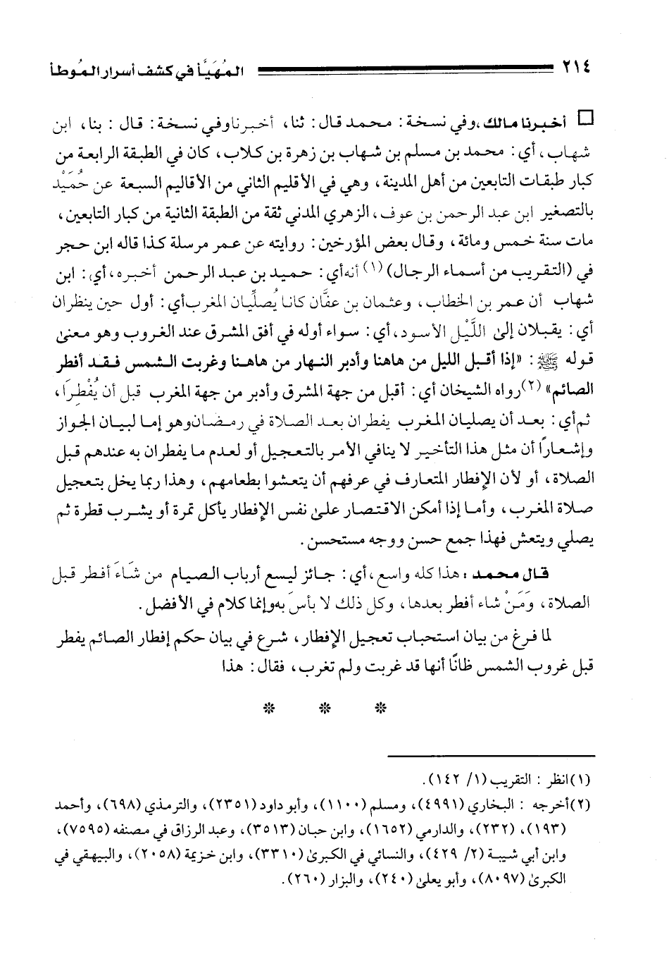 • أخبرنا مالك، وفي نسخة: محمد قال: ثنا، أخبرنا وفي نسخة: قال: بنا، ابن شهاب، أي: محمد بن مسلم بن شهاب بن زهرة بن كلاب، كان في الطبقة الرابعة من كبار طبقات التابعين من أهل المدينة، وهي في الإقليم الثاني من الأقاليم السبعة عن حُمَيْد بالتصغير ابن عبد الرحمن بن عوف، الزهري المدني ثقة من الطبقة الثانية من كبار التابعين، مات سنة خمس ومائة، وقال بعض المؤرخين: روايته عن عمر مرسلة كذا قاله ابن حجر في (التقريب من أسماء الرجال) (¬1) أنه أي: حميد بن عبد الرحمن أخبره، أي: ابن شهاب أن عمر بن الخطاب، وعثمان بن عفَّان كانا يُصلِّيان المغرب أي: أول حين ينظران أي: يقبلان إلي اللَّيْل الأسود، أي: سواء أوله في أفق المشرق عند الغروب وهو معنى قوله - صلى الله عليه وسلم -: "إذا أقبل الليل من ها هنا وأدبر النهار من ها هنا وغربت الشمس فقد أفطر الصائم" (¬2) رواه الشيخان أي: أقبل من جهة المشرق وأدبر من جهة المغرب قبل أن يُفْطِرَا، ثم أي: بعد أن يصليان المغرب يفطران بعد الصلاة في رمضان وهو إما لبيان الجواز وإشعارًا أن مثل هذا التأخير لا ينافي الأمر بالتعجيل أو لعدم ما يفطران به عندهم قبل الصلاة، أو لأن الإِفطار المتعارف في عرفهم أن يتعشوا بطعامهم، وهذا ربما يخل بتعجيل صلاة المغرب، وأما إذا أمكن الاقتصار على نفس الإِفطار يأكل تمرة أو يشرب قطرة ثم يصلي ويتعش فهذا جمع حسن ووجه مستحسن.