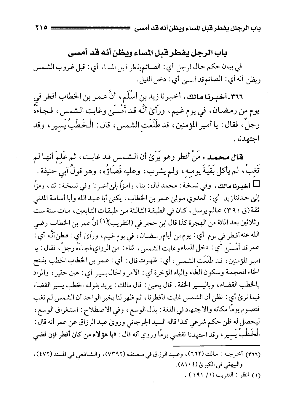 366 - أخبرنا مالك، أخبرنا زيد بن أسْلَم، أنَّ عمر بن الخطاب أفطر في يوم من رمضان، في يوم غيم، ورَأى أنَّه قد أَمْسَى وغابت الشمس، فجاءَهُ رجلٌ، فقال: يا أمير المؤمنين، قد طَلَعَتِ الشمس، قال: الْخَطْبُ يَسِير، وقد اجتهدنا.