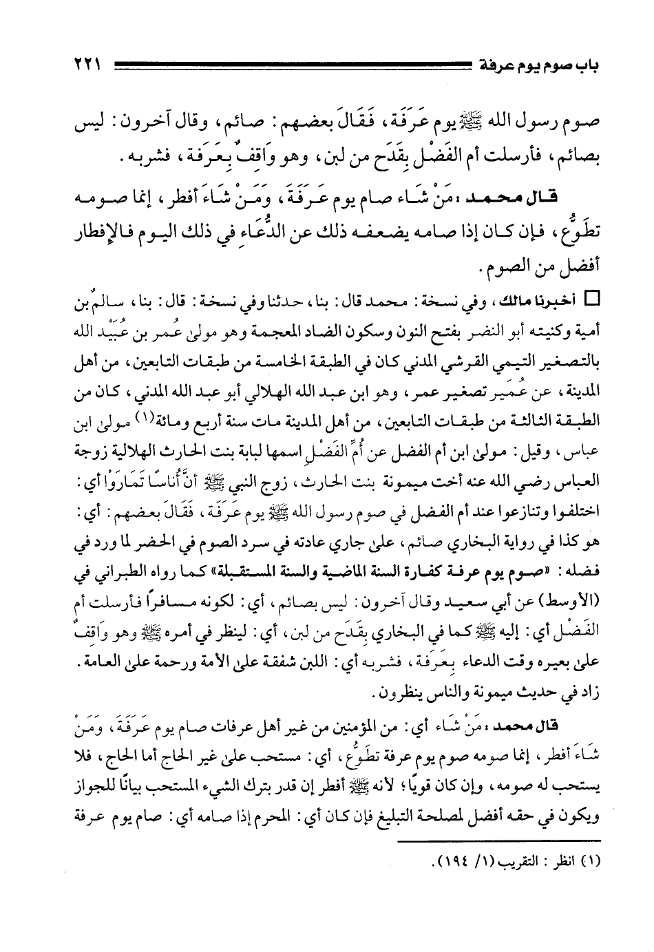 صوم رسول الله - صلى الله عليه وسلم - يوم عَرَفَة، فَقَالَ بعضهم: صائم، وقال آخرون: ليس بصائم، فأرسلت أم الفَضْل بِقَدَح من لبن، وهو وَاقِفٌ بِعَرَفة، فشربه.