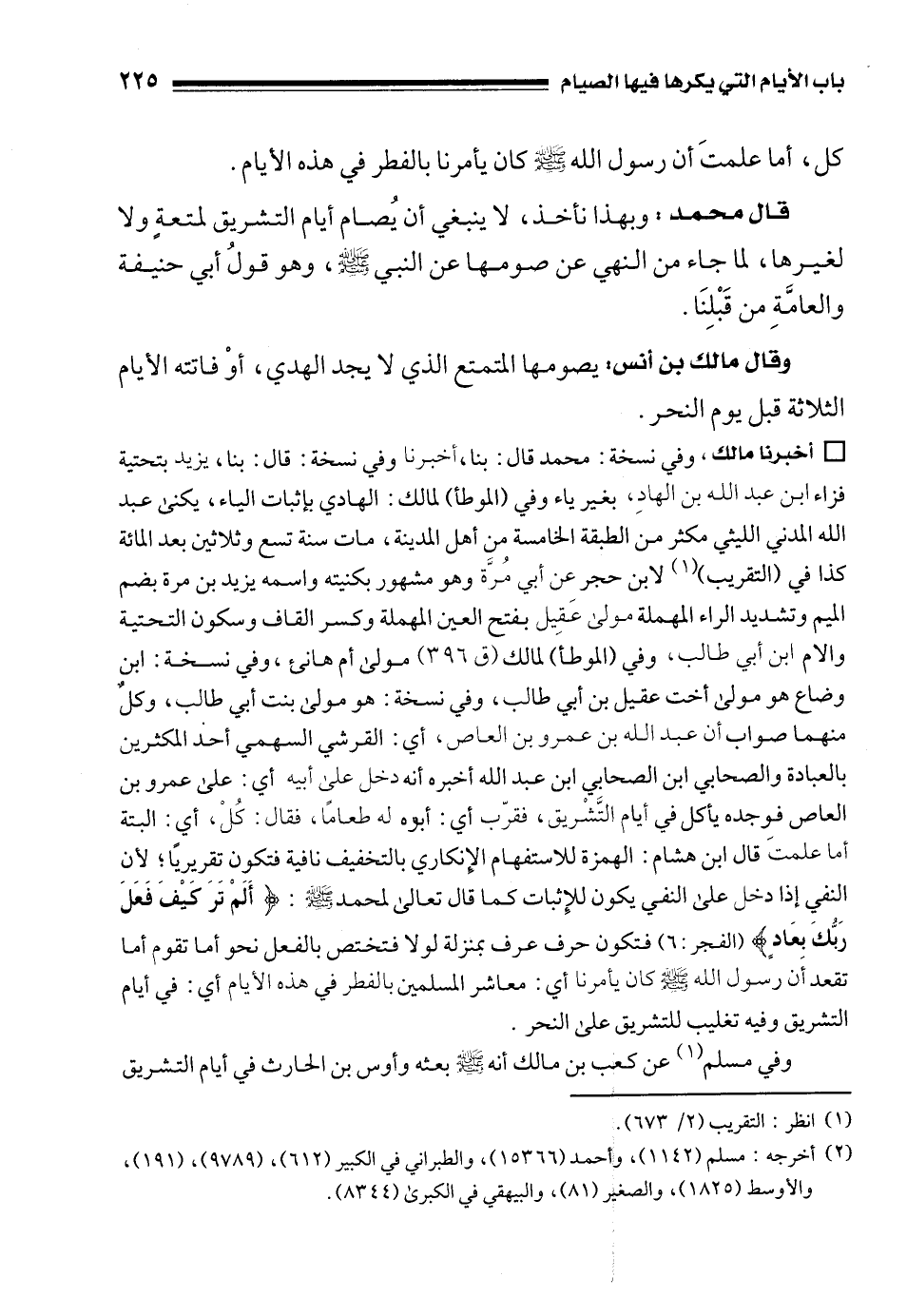 • أخبرنا مالك، وفي نسخة: محمد قال: بنا، أخبرنا وفي نسخة: قال: بنا، يزيد بتحتية فزاء ابن عبد الله بن الهادِ، بغير ياء وفي (الموطأ) لمالك: الهادي بإثبات الياء، يكنى عبد الله المدني الليثي مكثر من الطبقة الخامسة من أهل المدينة، مات سنة تسع وثلاثين بعد المائة كذا في (التقريب) (¬1) لابن حجر عن أبي مُرَّة وهو مشهور بكنيته واسمه يزيد بن مرة بضم الميم وتشديد الراء المهملة مولى عَقِيل بفتح العين المهملة وكسر القاف وسكون التحتية والام ابن أبي طابي، وفي (الموطأ) لمالك (ق 396) مولى أم هانئ، وفي نسخة: ابن وضاع هو مولى أخت عقيل بن أبي طالب، وفي نسخة: هو مولى بنت أبي طالب، وكلٌ منهما صواب أن عبد الله بن عمرو بن العاص، أي: القرشي السهمي أحد المكثرين بالعبادة والصحابي ابن الصحابي ابن عبد الله أخبره أنه دخل على أبيه أي: على عمرو بن العاص فوجده يأكل في أيام التَّشْريق، فقرّب أي: أبوه له طعامًا، فقال: كُلْ، أي: البتة أما علمتَ قال ابن هشام: الهمزة للاستفهام الإِنكاري بالتخفيف نافية فتكون تقريريًا؛ لأن النفي إذا دخل على النفي يكون للإِثبات كما قال تعالى لمحمد - صلى الله عليه وسلم -: {أَلَمْ تَرَ كَيْفَ فَعَلَ رَبُّكَ بِعَادٍ} [الفجر: 6] فتكون حرف عرف بمنزلة لولا فتختص بالفعل نحو أما تقوم أما تقعد أن رسول الله - صلى الله عليه وسلم - كان يأمرنا أي: معاشر المسلمين بالفطر في هذه الأيام أي: في أيام التشريق وفيه تغليب للتشريق على النحر.