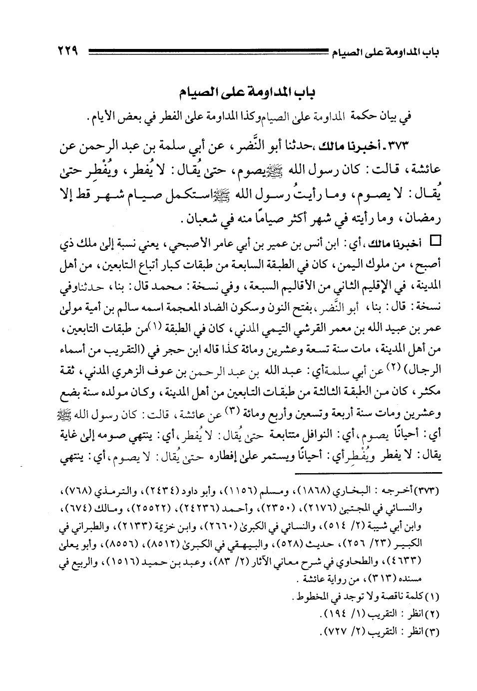 373 - أخبرنا مالك، حدثنا أبو النَّضر، عن أبي سلمة بن عبد الرحمن عن عائشة، قالت: كان رسول الله - صلى الله عليه وسلم - يصوم، حتى يُقال: لا يُفطر، ويُفْطِر حتى يُقال: لا يصوم، وما رأيتُ رسول الله - صلى الله عليه وسلم - استكمل صيام شهر قط إلا رمضان، وما رأيته في شهر أكثر صيامًا منه في شعبان.