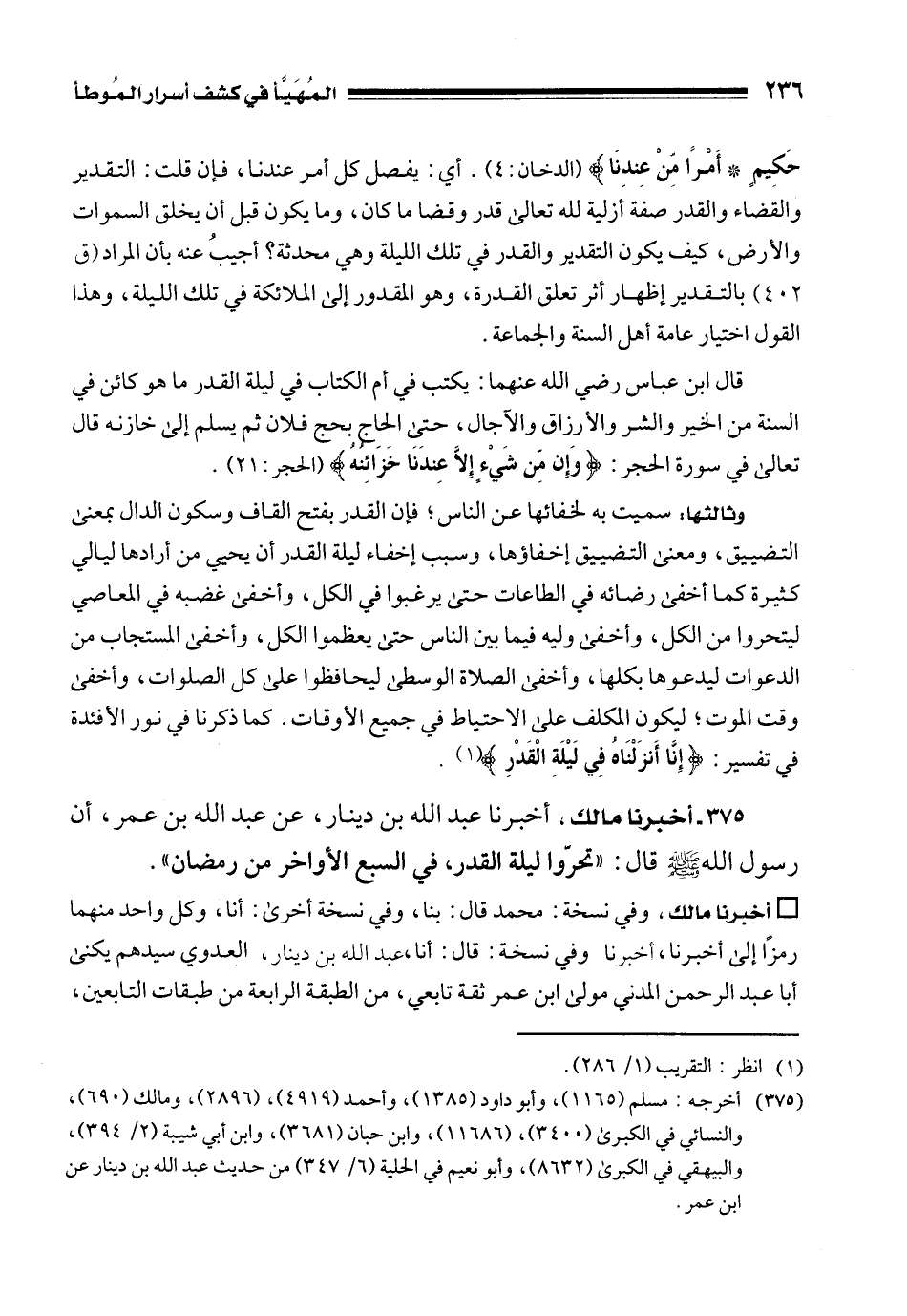 375 - أخبرنا مالك، أخبرنا عبد الله بن دينار، عن عبد الله بن عمر، أن رسول الله - صلى الله عليه وسلم - قال: "تحرّوا ليلة القدر، في السبع الأواخر من رمضان".