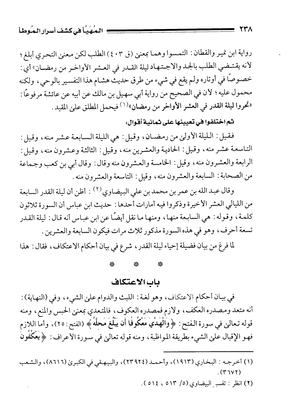 في بيان أحكام الاعتكاف، وهو لغة: اللبث والدوام على الشيء، وفي (النهاية): أنه متعد ومصدره العكف، ولازم فمصدره العكوف، فالمتعدي بمعنى الحبس والمنع، ومنه قوله تعالى في سورة الفتح: {وَالْهَدْيَ مَعْكُوفًا أَنْ يَبْلُغَ مَحِلَّهُ} [الفتح: 25]، وأما اللازم فهو الإِقبال على الشيء بطريقة المواظبة، ومنه قوله تعالى في سورة الأعراف: {يَعْكُفُونَ