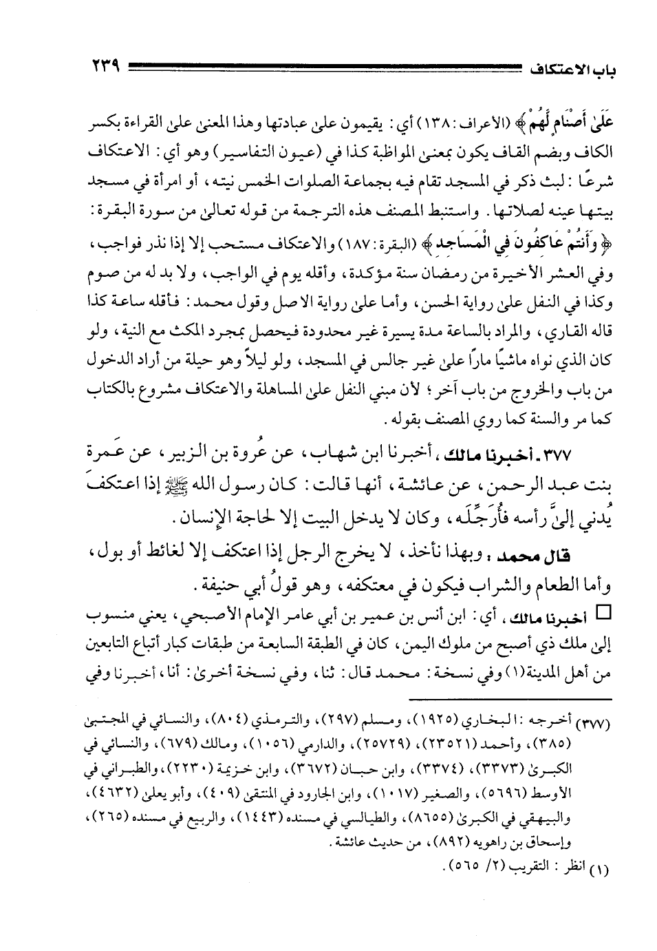 377 - أخبرنا مالك, أخبرنا ابن شهاب، عن عُروة بن الزبير، عن عَمرة بنت عبد الرحمن، عن عائشة، أنها قالت: كان رسول الله - صلى الله عليه وسلم - إذا اعتكفَ يُدني إليَّ رأسه فأُرَجِّلَه، وكان لا يدخل البيت إلا لحاجة الإِنسان.