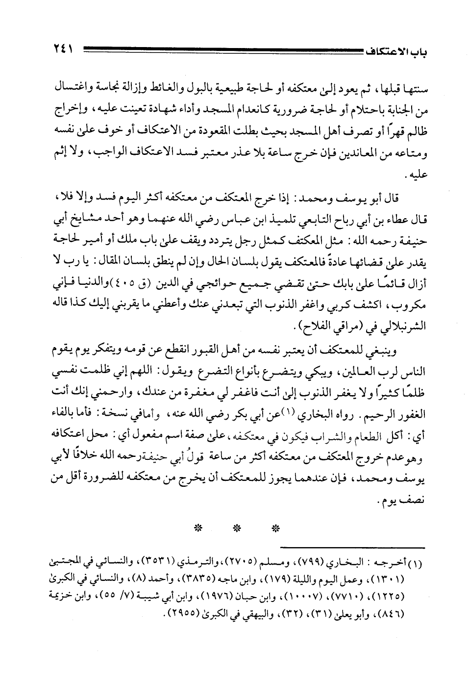 قال أبو يوسف ومحمد: إذا خرج المعتكف من معتكفه أكثر اليوم فسد وإلا فلا، قال عطاء بن أبي رباح التابعي تلميذ ابن عباس رضي الله عنهما وهو أحد مشايخ أبي حنيفة رحمه الله: مثل المعتكف كمثل رجل يتردد ويقف على باب ملك أو أمير لحاجة يقدر على قضائها عادةً فالمعتكف يقول بلسان الحال وإن لم ينطق بلسان المقال: يا رب لا أزال قائمًا على بابك حتى تقضي جميع حوائجي في الدين (ق 405) والدنيا فإني مكروب، اكشف كربي واغفر الذنوب التي تبعدني عنك وأعطني ما يقربني إليك كذا قاله الشرنبلالي في (مراقي الفلاح).