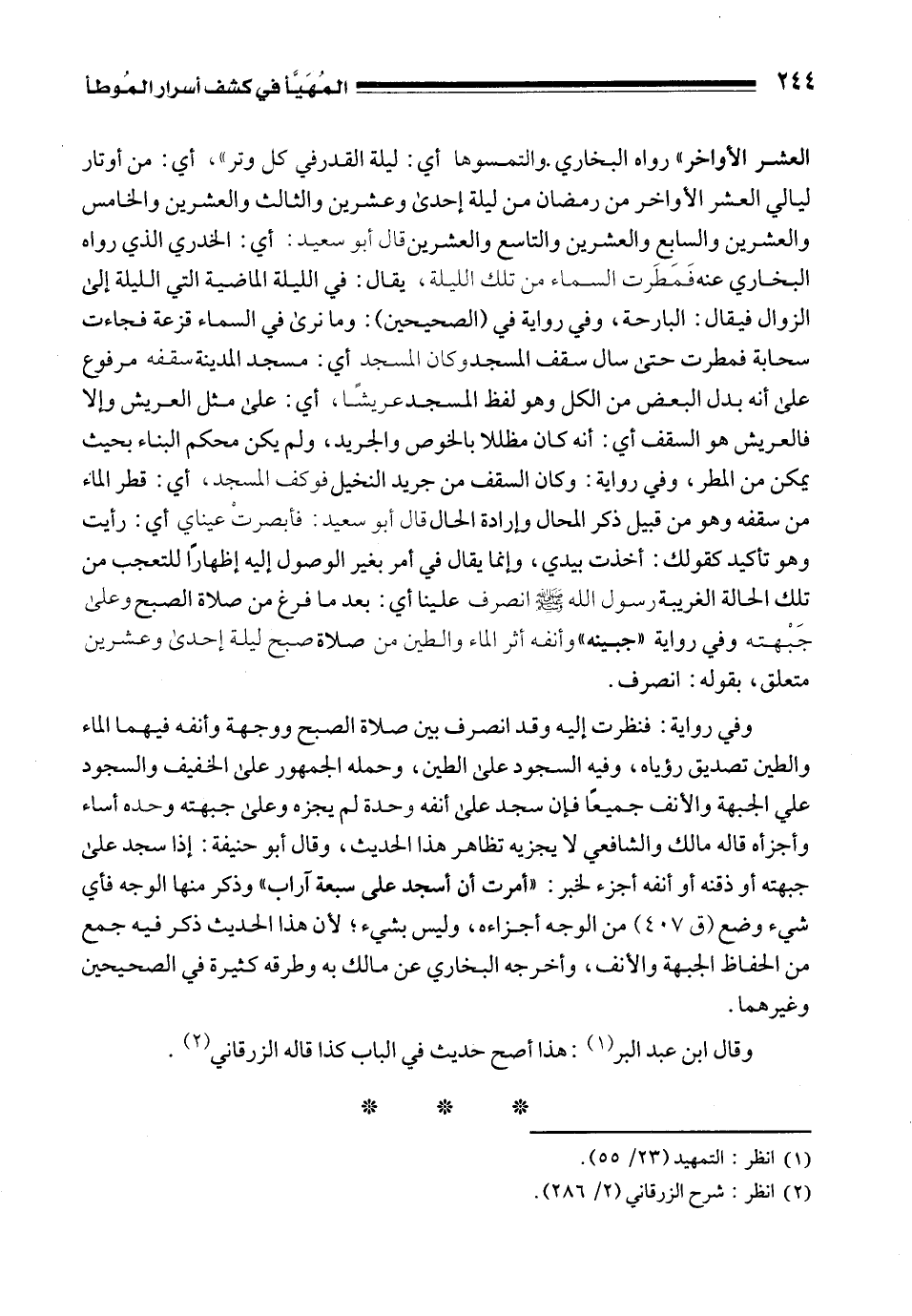 العشر الأواخر" رواه البخاري. والتمسوها أي: ليلة القدر في كل وتر"، أي: من أوتار ليالي العشر الأواخر من رمضان من ليلة إحدى وعشرين والثالث والعشرين والخامس والعشرين والسابع والعشرين والتاسع والعشرين قال أبو سعيد: أي: الخدري الذي رواه البخاري عنه فَمَطَرت السماء من تلك الليلة، يقال: في الليلة الماضية التي الليلة إلى الزوال فيقال: البارحة، وفي رواية في (الصحيحين): وما نرى في السماء قزعة فجاءت سحابة فمطرت حتى سال سقف المسجد وكان المسجد أي: مسجد المدينة سقفه مرفوع على أنه بدل البعض من الكل وهو لفظ المسجد عريشًا، أي: على مثل العريش وإلا فالعريش هو السقف أي: أنه كان مظللا بالخوص والجريد، ولم يكن محكم البناء بحيث يمكن من المطر، وفي رواية: وكان السقف من جريد النخيل فوكف المسجد، أي: قطر الماء من سقفه وهو من قبيل ذكر المحال وإرادة الحال قال أبو سعيد: فأبصرت عيناي أي: رأيت وهو تأكيد كقولك: أخذت بيدي، وإنما يقال في أمر بغير الوصول إليه إظهارًا للتعجب من تلك الحالة الغريبة رسول الله - صلى الله عليه وسلم - انصرف علينا أي: بعد ما فرغ من صلاة الصبح وعلى جَبْهته وفي رواية "جبينه" وأنفه أثر الماء والطين من صلاة صبح ليلة إحدى وعشرين متعلق، بقوله: انصرف.