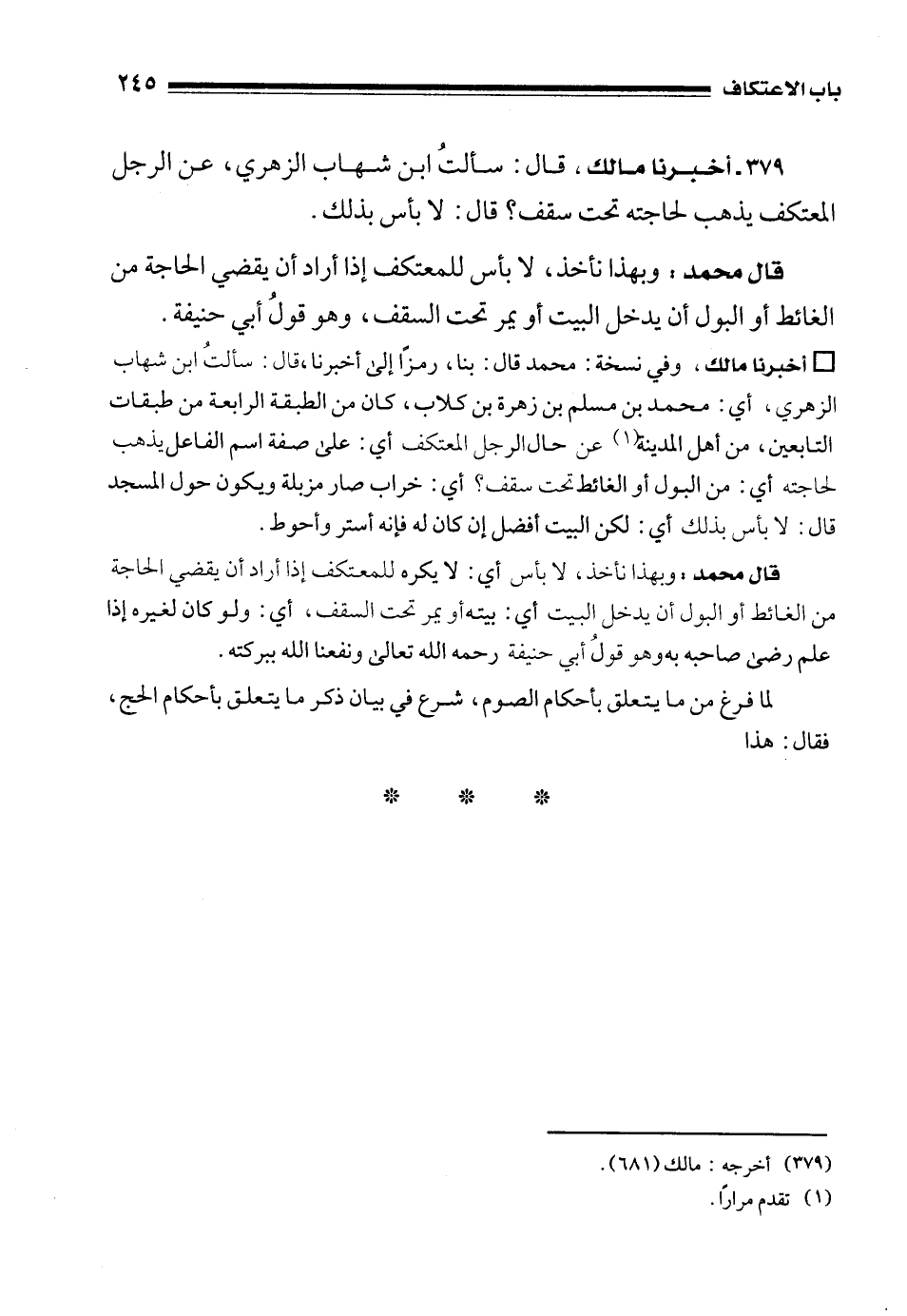 379 - أخبرنا مالك، قال: سألتُ ابن شهاب الزهري، عن الرجل المعتكف يذهب لحاجته تحت سقف؟ قال: لا بأس بذلك.