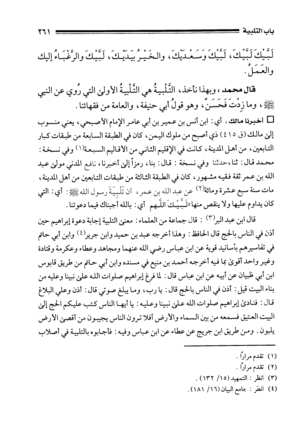 قال محمد: وبهذا نأخذ، التَّلْبيةُ هي التَّلْبيةُ الأولى التي رُوي عن النبي - صلى الله عليه وسلم -، وما زِدْتَ فَحَسَنٌ، وهو قولُ أبي حنيفة، والعامة من فقهائنا.