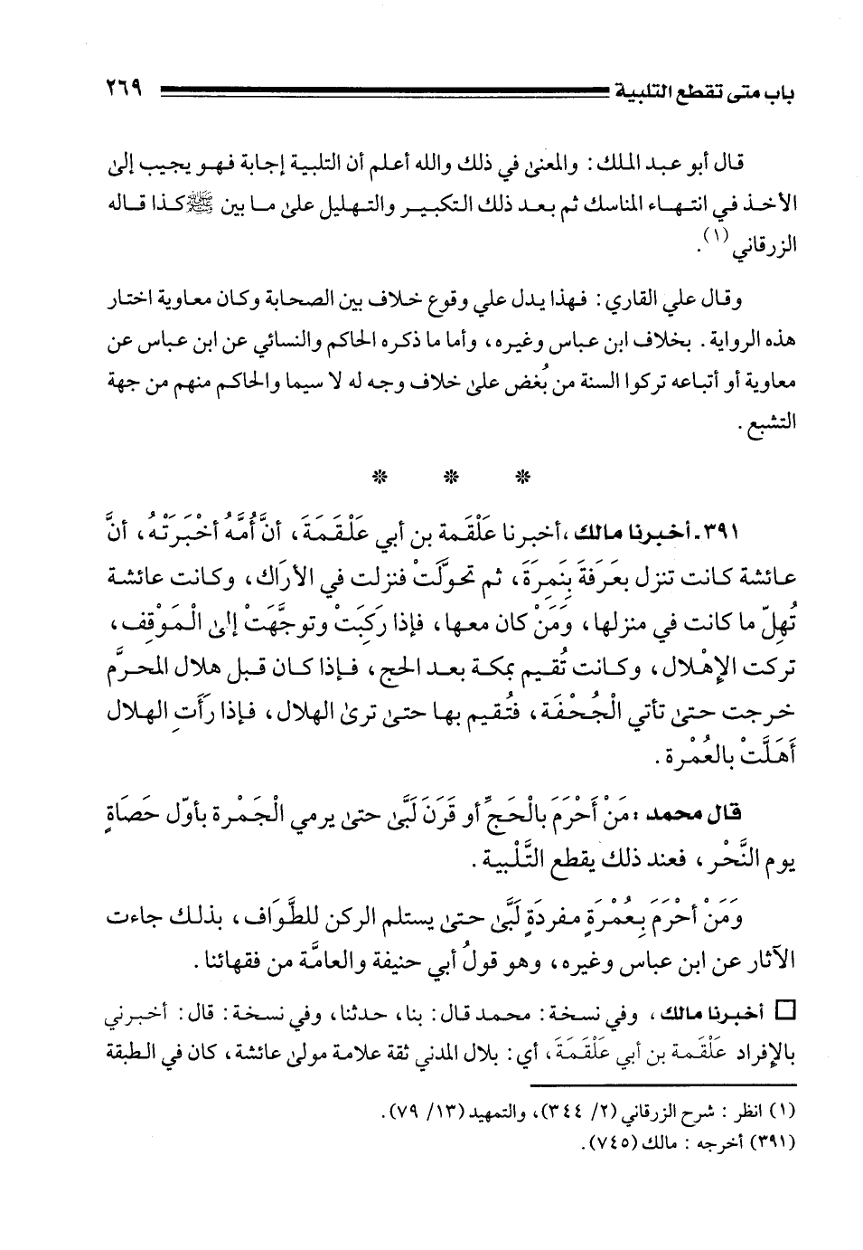 391 - أخبرنا مالك، أخبرنا عَلْقَمة بن أبي عَلْقَمَةَ، أنَّ أُمَّهُ أخْبَرَتْهُ، أنَّ عائشة كانت تنزل بعَرَفةَ بِنَمِرَةَ، ثم تحوَّلَتْ فنزلت في الأرَاك، وكانت عائشة تُهِلّ ما كانت في منزلها، وَمَنْ كان معها، فإذا رَكِبَتْ وتوجَّهَتْ إلى الْمَوْقِف، تركت الإِهْلال، وكانت تُقيم بمكة بعد الحج، فإذا كان قبل هلال المحرَّم خرجت حتى تأتي الْجُحْفَة، فتُقيم بها حتى ترى الهلال، فإذا رَأَتِ الهلال أَهَلَّتْ بالعُمْرة.