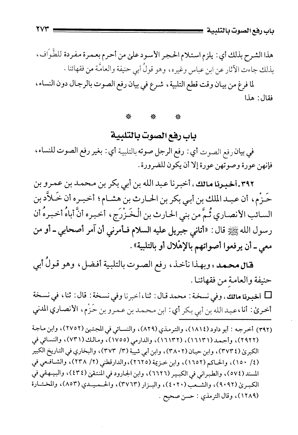 392 - أخبرنا مالك، أخبرنا عبد الله بن أبي بكر بن محمد بن عمرو بن حَزْم، أن عبد الملك بن أبي بكر بن الحارث بن هشام؛ أخبره أن خَلَّاد بن السائب الأنصاري ثُمَّ من بني الحارث بن الْخَزْرَج، أخبره أنَّ أباهُ أخبرهُ أن رسول الله - صلى الله عليه وسلم - قال: "أتاني جبريل عليه السلام فأمرني أن آمر أصحابي - أو من معي - أن يرفعوا أصواتهم بالإهْلال أو بالتلبية".