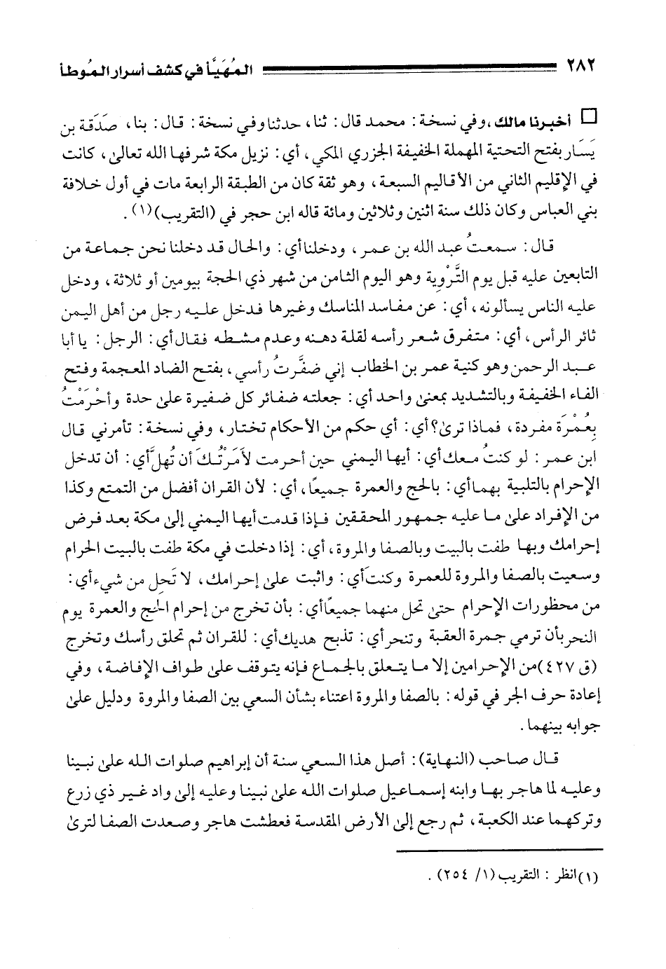 قال: سمعتُ عبد الله بن عمر، ودخلنا أي: والحال قد دخلنا نحن جماعة من التابعين عليه قبل يوم التَّرْوِية وهو اليوم الثامن من شهر ذي الحجة بيومين أو ثلاثة، ودخل عليه الناس يسألونه، أي: عن مفاسد المناسك وغيرها فدخل عليه رجل من أهل اليمن ثائر الرأس، أي: متفرق شعر رأسه لقلة دهنه وعدم مشطه فقال أي: الرجل: يا أبا عبد الرحمن وهو كنية عمر بن الخطاب إني ضفَّرتُ رأسي، بفتح الضاد المعجمة وفتح الفاء الخفيفة وبالتشديد بمعنى واحد أي: جعلته ضفائر كل ضفيرة على حدة وأحْرَمْتُ بِعُمْرَة مفردة، فماذا ترى؟ أي: أي حكم من الأحكام تختار، وفي نسخة: تأمرني قال ابن عمر: لو كنتُ معك أي: أيها اليمني حين أحرمت لأَمَرْتُكَ أن تُهلَّ أي: أن تدخل الإِحرام بالتلبية بهما أي: بالحج والعمرة جميعًا، أي: لأن القران أفضل من التمتع وكذا من الإِفراد على ما عليه جمهور المحققين فإذا قدمت أيها اليمني إلى مكة بعد فرض إحرامك وبها طفت بالبيت وبالصفا والمروة، أي: إذا دخلت في مكة طفت بالبيت الحرام وسعيت بالصفا والمروة للعمرة وكنتَ أي: واثبت على إحرامك، لا تَحِل من شيء أي: من محظورات الإِحرام حتى تحل منهما جميعًا أي: بأن تخرج من إحرام الحج والعمرة يوم النحر بأن ترمي جمرة العقبة وتنحر أي: تذبح هديك أي: للقران ثم تحلق رأسك وتخرج (ق 427) من الإِحرامين إلا ما يتعلق بالجماع فإنه يتوقف على طواف الإِفاضة، وفي إعادة حرف الجر في قوله: بالصفا والمروة اعتناء بشأن السعي بين الصفا والمروة ودليل على جوابه بينهما.