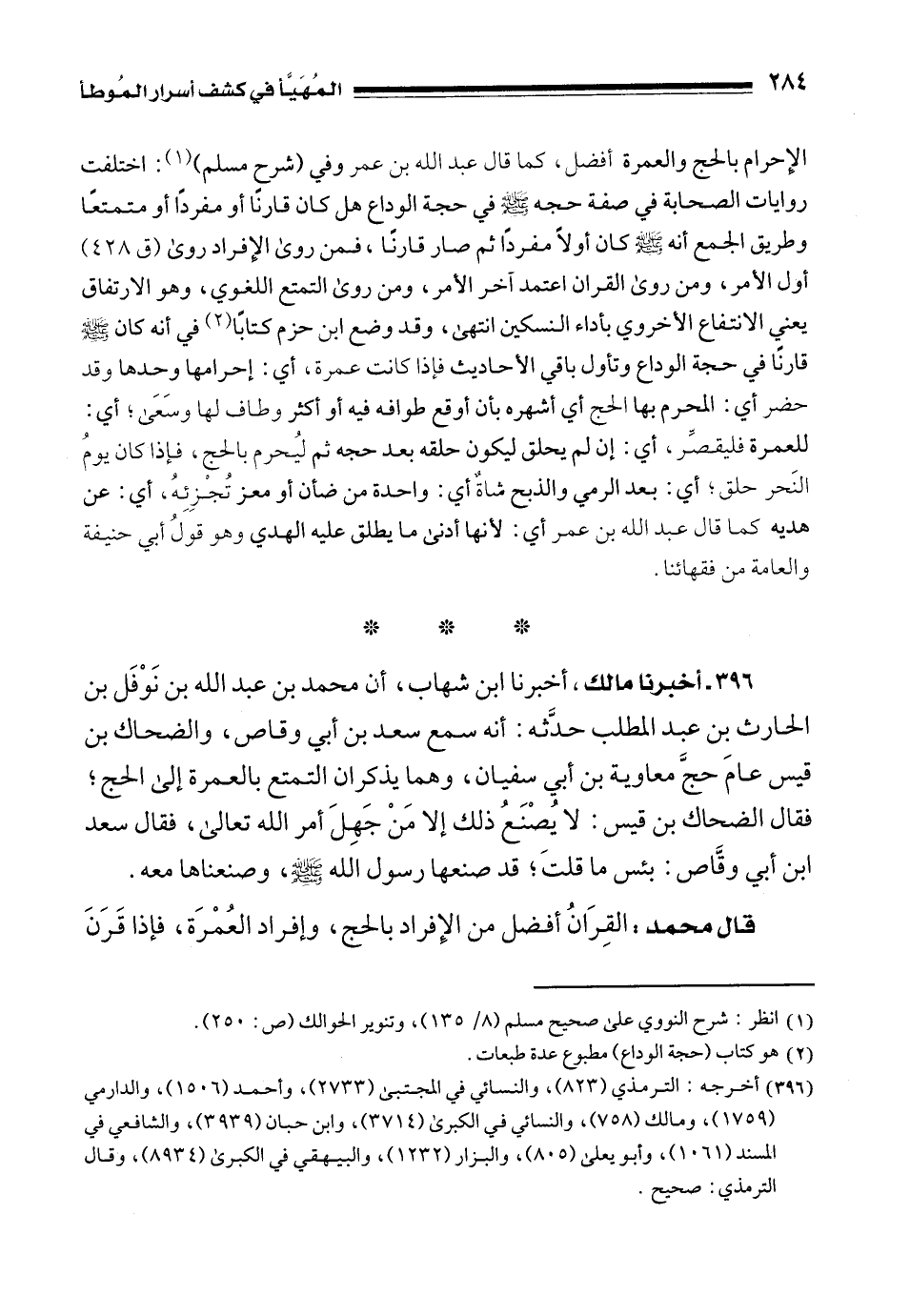 396 - أخبرنا مالك، أخبرنا ابن شهاب، أن محمد بن عبد الله بن نَوْفَل بن الحارث بن عبد المطلب حدَّثه: أنه سمع سعد بن أبي وقاص، والضحاك بن قيس عامَ حجَّ معاوية بن أبي سفيان، وهما يذكران التمتع بالعمرة إلى الحج؛ فقال الضحاك بن قيس: لا يُصْنَعُ ذلك إلا مَنْ جَهِلَ أمر الله تعالى، فقال سعد بن أبي وقَّاص: بئس ما قلتَ؛ قد صنعها رسول الله - صلى الله عليه وسلم -، وصنعناها معه.