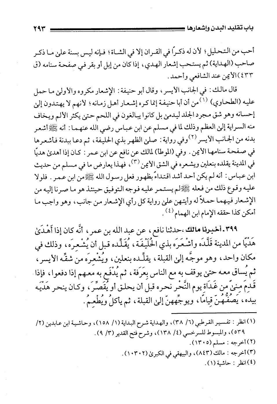 399 - أخبرنا مالك، حدثنا نافع، عن عبد الله بن عمر، أنَّه كان إذا أَهْدَى هَدْيًا من المدينة قَلَّدَه وأشْعَرَه بذي الحُلَيْفَة، يُقَلِّده قبل أن يُشْعِرَه، وذلك في مكان واحد، وهو موجَّه إلى القبلة، يقلِّده بنعلين، ويُشْعِرَه من شقِّه الأيسر، ثم يُساق معه حتى يوقف به مع الناس بِعَرَفة، ثم يُدْفَع به معهم إذا دفعوا، فإذا قَدِمَ مِنىً من غَدَاةِ يوم النَّحْر نحره قبل أن يحلق أو يُقَصِّرَ، وكان ينحر هَدْيَه بيده، يَصُفُّهُنّ قِيامًا، ويوجِّههنّ إلى القبلة، ثم يأكلُ ويُطْعِمُ.