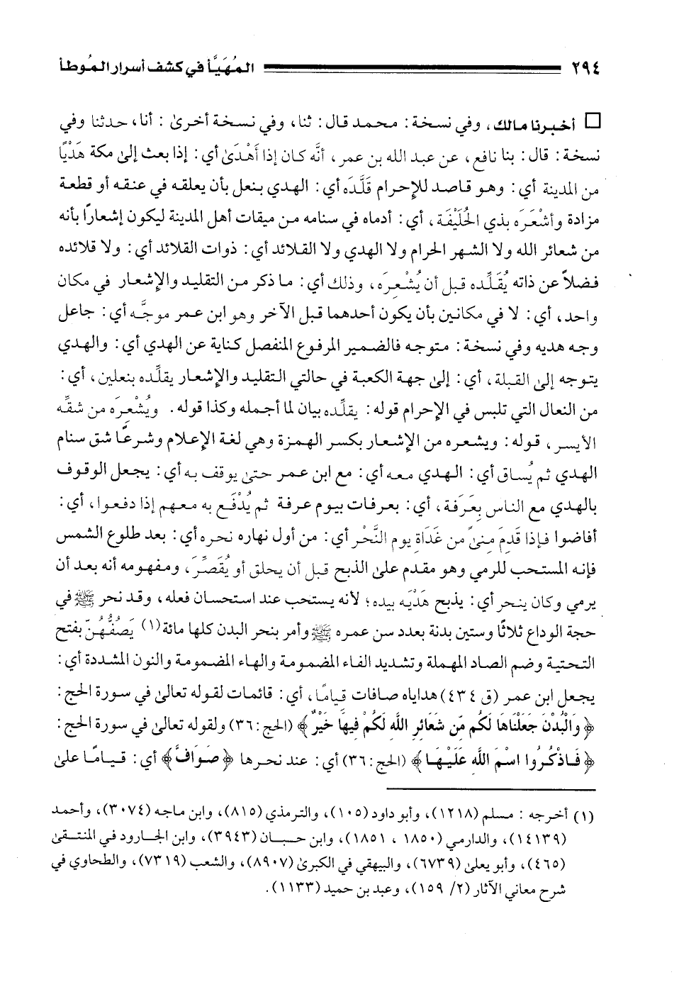 • أخبرنا مالك، وفي نسخة: محمد قال: ثنا، وفي نسخة أخرى: أنا، حدثنا وفي نسخة: قال: بنا نافع، عن عبد الله بن عمر، أنَّه كان إذا أَهْدَى أي: إذا بعث إلى مكة هَدْيًا من المدينة أي: وهو قاصد للإِحرام قَلَّدَه أي: الهدي بنعل بأن يعلقه في عنقه أو قطعة مزادة وأشْعَرَه بذي الحُلَيْفَة، أي: أدماه في سنامه من ميقات أهل المدينة ليكون إشعارًا بأنه من شعائر الله ولا الشهر الحرام ولا الهدي ولا القلائد أي: ذوات القلائد أي: ولا قلائده فضلًا عن ذاته يُقَلِّده قبل أن يُشْعِرَه، وذلك أي: ما ذكر من التقليد والإِشعار في مكان واحد، أي: لا في مكانين بأن يكون أحدهما قبل الآخر وهو ابن عمر موجَّه أي: جاعل وجه هديه وفي نسخة: متوجه فالضمير المرفوع المنفصل كناية عن الهدي أي: والهدي يتوجه إلى القبلة، أي: إلى جهة الكعبة في حالتي التقليد والإِشعار يقلِّده بنعلين، أي: من النعال التي تلبس في الإِحرام قوله: يقلِّده بيان لما أجمله وكذا قوله. ويُشْعِرَه من شقِّه الأيسر، قوله: ويشعره من الإِشعار بكسر الهمزة وهي لغة الإِعلام وشرعًا شق سنام الهدي ثم يُساق أي: الهدي معه أي: مع ابن عمر حتى يوقف به أي: يجعل الوقوف بالهدي مع الناس بِعَرَفة، أي: بعرفات بيوم عرفة ثم يُدْفَع به معهم إذا دفعوا، أي: أفاضوا فإذا قَدِمَ مِنىً من غَدَاةِ يوم النَّحْر أي: من أول نهاره نحره أي: بعد طلوع الشمس فإنه المستحب للرمي وهو مقدم على الذبح قبل أن يحلق أو يُقَصِّرَ، ومفهومه أنه بعد أن يرمي وكان ينحر أي: يذبح هَدْيَه بيده؛ لأنه يستحب عند استحسان فعله، وقد نحر - صلى الله عليه وسلم - في حجة الوداع ثلاثًا وستين بدنة بعدد سن عمره - صلى الله عليه وسلم - وأمر بنحر البدن كلها مائة (¬1) يَصُفُّهُنّ بفتح التحتية وضم الصاد المهملة وتشديد الفاء المضمومة والهاء المضمومة والنون المشددة أي: يجعل ابن عمر (ق 434) هداياه صافات قِيامًا، أي: قائمات لقوله تعالى في سورة الحج: {وَالْبُدْنَ جَعَلْنَاهَا لَكُمْ مِنْ شَعَائِرِ اللَّهِ لَكُمْ فِيهَا خَيْرٌ} [الحج: 36] ولقوله تعالى في سورة الحج: {فَاذْكُرُوا اسْمَ اللَّهِ عَلَيْهَا} [الحج: 36] أي: عند نحرها {صَوَافَّ} أي: قيامًا على