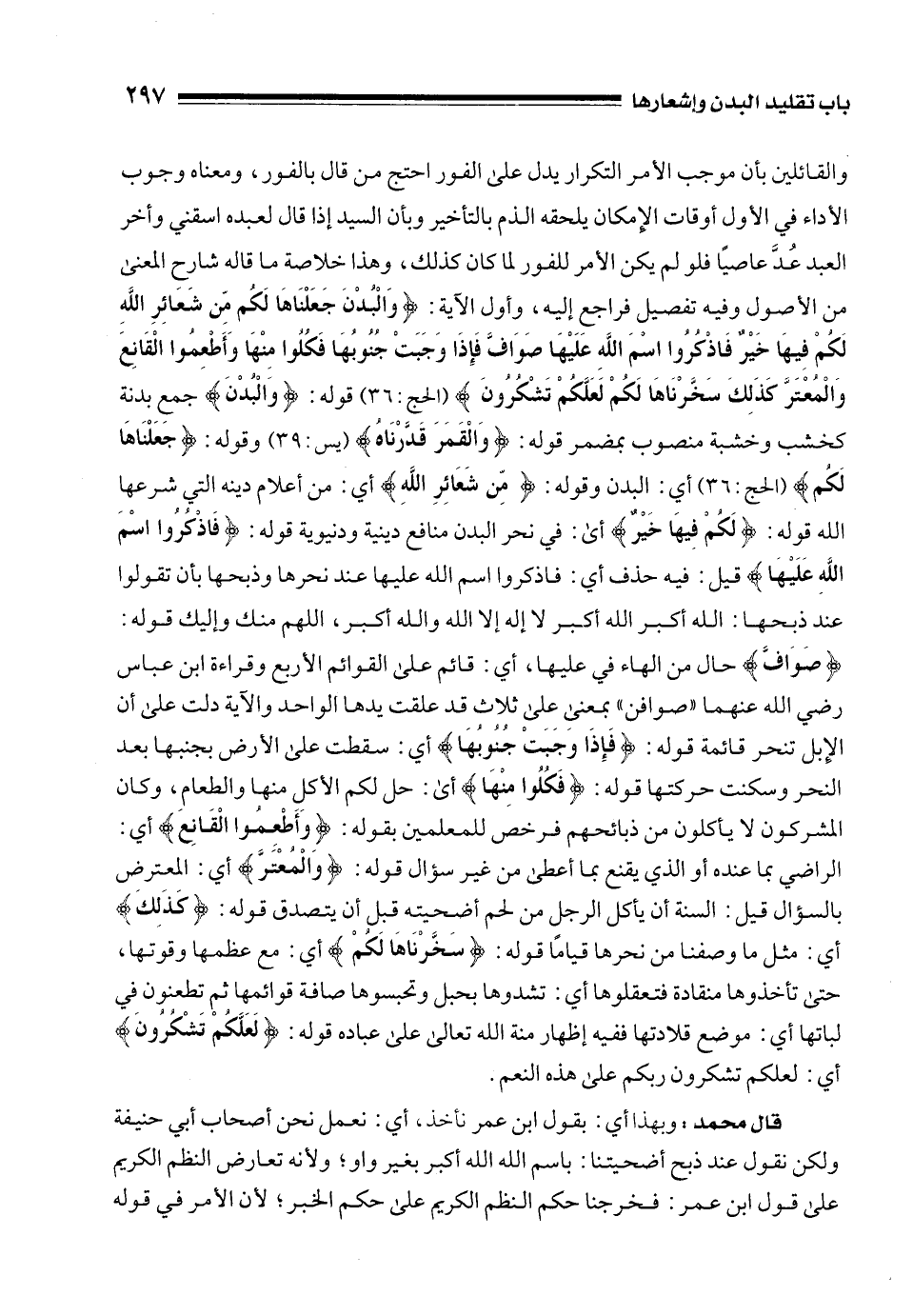 والقائلين بأن موجب الأمر التكرار يدل على الفور احتج من قال بالفور، ومعناه وجوب الأداء في الأول أوقات الإِمكان يلحقه الذم بالتأخير وبأن السيد إذا قالى لعبده اسقني وأخر العبد عُدَّ عاصيًا فلو لم يكن الأمر للفور لما كان كذلك، وهذا خلاصة ما قاله شارح المعنى من الأصول وفيه تفصيل فراجع إليه، وأول الآية: {وَالْبُدْنَ جَعَلْنَاهَا لَكُمْ مِنْ شَعَائِرِ اللَّهِ لَكُمْ فِيهَا خَيْرٌ فَاذْكُرُوا اسْمَ اللَّهِ عَلَيْهَا صَوَافَّ فَإِذَا وَجَبَتْ جُنُوبُهَا فَكُلُوا مِنْهَا وَأَطْعِمُوا الْقَانِعَ وَالْمُعْتَرَّ كَذَلِكَ سَخَّرْنَاهَا لَكُمْ لَعَلَّكُمْ تَشْكُرُونَ} [الحج: 36] قوله: {وَالْبُدْنَ} جمع بدنة كخشب وخشبة منصوب بمضمر قوله: {وَالْقَمَرَ قَدَّرْنَاهُ} [يس: 39] وقوله: {جَعَلْنَاهَا لَكُمْ} [الحج: 36] أي: البدن وقوله: {مِنْ شَعَائِرِ اللَّهِ} أي: من أعلام دينه التي شرعها الله قوله: {لَكُمْ فِيهَا خَيْرٌ} أى: في نحر البدن منافع دينية ودنيوية قوله: {فَاذْكُرُوا اسْمَ اللَّهِ عَلَيْهَا} قيل: فيه حذف أي: فاذكروا اسم الله عليها عند نحرها وذبحها بأن تقولوا عند ذبحها: الله أكبر الله أكبر لا إله إلا الله والله أكبر، اللهم منك وإليك قوله: {صَوَافَّ} حال من الهاء في عليها، أي: قائم على القوائم الأربع وقراءة ابن عباس رضي الله عنهما "صوافن" بمعنى على ثلاث قد علقت يدها الواحد والآية دلت على أن الإِبل تنحر قائمة قوله: {فَإِذَا وَجَبَتْ جُنُوبُهَا} أي: سقطت على الأرض بجنبها بعد النحر وسكنت حركتها قوله: {فَكُلُوا مِنْهَا} أى: حل لكم الأكل منها والطعام، وكان المشركون لا يأكلون من ذبائحهم فرخص للمعلمين بقوله: {وَأَطْعِمُوا الْقَانِعَ} أي: الراضي بما عنده أو الذي يقنع بما أعطى من غير سؤال قوله: {وَالْمُعْتَرَّ} أي: المعترض بالسؤال قيل: السنة أن يأكل الرجل من لحم أضحيته قبل أن يتصدق قوله: {كَذَلِكَ} أي: مثل ما وصفنا من نحرها قيامًا قوله: {سَخَّرْنَاهَا لَكُمْ} أي: مع عظمها وقوتها، حتى تأخذوها منقادة فتعقلوها أي: تشدوها بحبل وتحبسوها صافة قوائمها ثم تطعنون في لباتها أي: موضع قلادتها ففيه إظهار منة الله تعالى على عباده قوله: {لَعَلَّكُمْ تَشْكُرُونَ} أي: لعلكم تشكرون ربكم على هذه النعم.