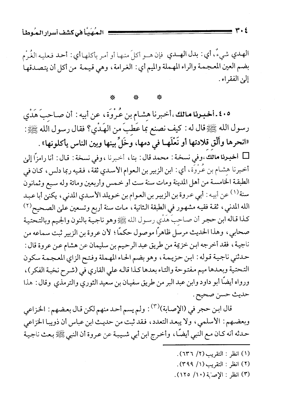 405 - أخبرنا مالك، أخبرنا هِشام بن عُرْوَة، عن أبيه: أن صاحِبَ هَدْي رسول الله - صلى الله عليه وسلم - قال له: كيف نصنع بما عَطِبَ من الهَدْي؟ فقال رسول الله - صلى الله عليه وسلم -: "انحرها وأَلْقِ قِلادتها أو نَعْلَها في دمها، وخَلِّ بينها وبين الناس يأكلونها".