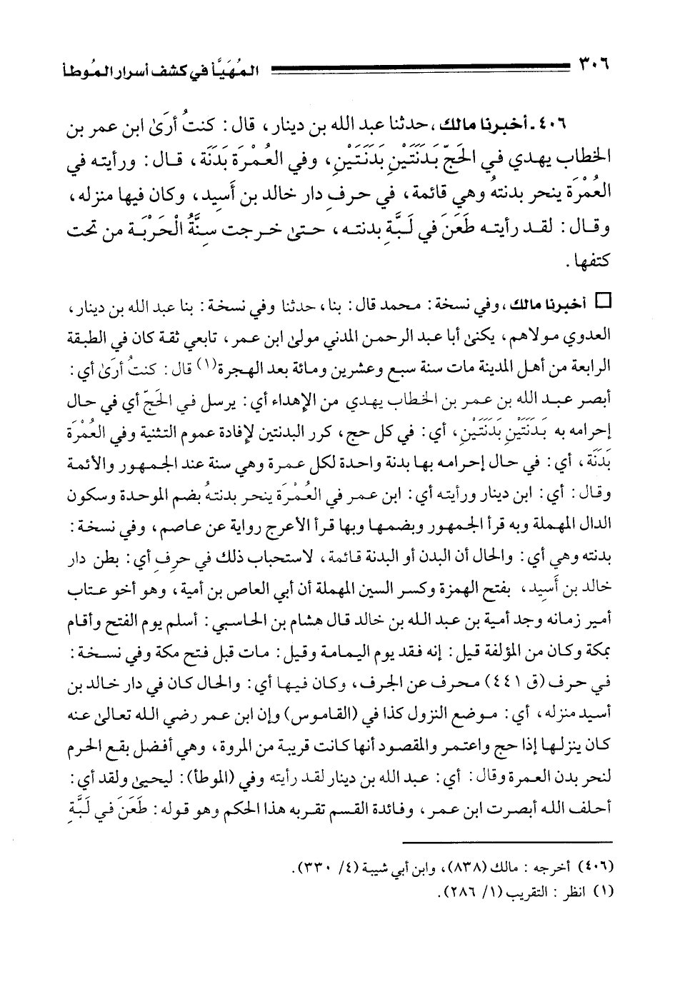406 - أخبرنا مالك، حدثنا عبد الله بن دينار، قال: كنتُ أرَى ابن عمر بن الخطاب يهدي في الحَجّ بَدَنَتَيْنِ بَدَنَتَيْنِ، وفي العُمْرَة بَدَنَة، قال: ورأيته في العُمْرَة ينحر بدنتهُ وهي قائمة، في حرفِ دار خالد بن أَسِيد، وكان فيها منزله، وقال: لقد رأيته طَعَنَ في لَبَّةِ بدنته، حتى خرجت سِنَّةُ الْحَرْبَة من تحت كتفها.