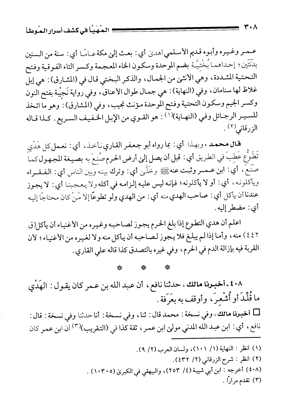 408 - أخبرنا مالك، حدثنا نافع، أن عبد الله بن عمر كان يقول: الهَدْي ما قُلِّدَ أو أُشْعِرَ، وأوقف به بعَرَفة.
