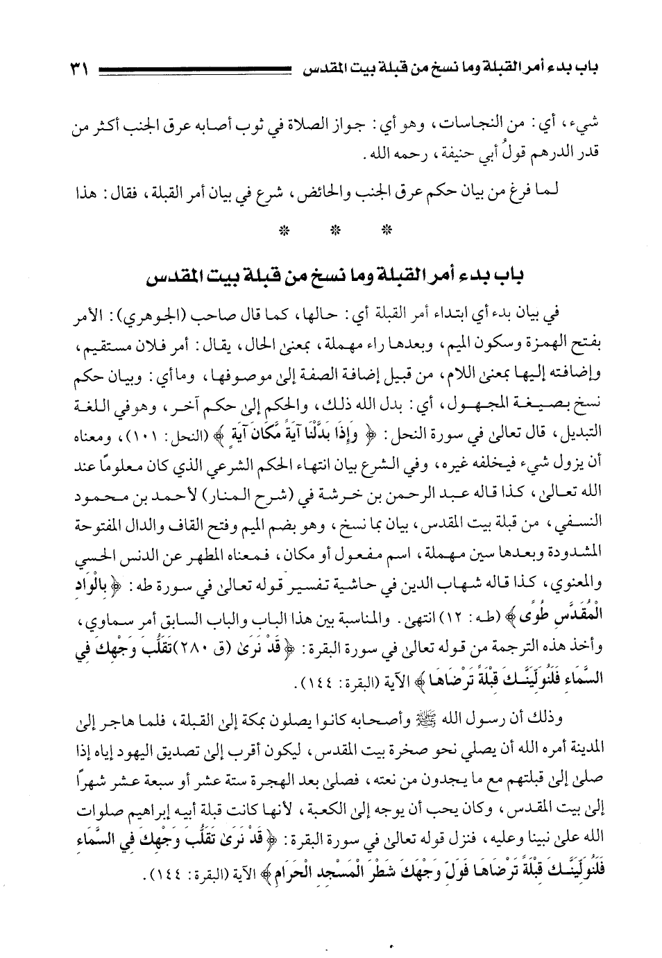 في بيان بدء أي ابتداء أمر القبلة أي: حالها، كما قال صاحب (الجوهري): الأمر بفتح الهمزة وسكون الميم، وبعدها راء مهملة، بمعنى الحال، يقال: أمر فلان مستقيم، وإضافته إليها بمعنى اللام، من قبيل إضافة الصفة إلى موصوفها، وما أي: وبيان حكم نسخ بصيغة المجهول، أي: بدل الله ذلك، والحكم إلى حكم آخر، وهو في اللغة التبديل، قال تعالى في سورة النحل: {وَإِذَا بَدَّلْنَا آيَةً مَكَانَ آيَةٍ} [النحل: 101]، ومعناه أن يزول شيء فيخلفه غيره، وفي الشرع بيان انتهاء الحكم الشرعي الذي كان معلومًا عند الله تعالى، كذا قاله عبد الرحمن بن خرشة في (شرح المنار) لأحمد بن محمود النسفي، من قبلة بيت المقدس، بيان بما نسخ، وهو بضم الميم وفتح القاف والدال المفتوحة المشدودة وبعدها سين مهملة، اسم مفعول أو مكان، فمعناه المطهر عن الدنس الحسي والمعنوي، كذا قاله شهاب الدين في حاشية تفسير قوله تعالى في سورة طه: {بِالْوَادِ الْمُقَدَّسِ طُوًى} [طه: 12] انتهى. والمناسبة بين هذا الباب والباب السابق أمر سماوي، وأخذ هذه الترجمة من قوله تعالى في سورة البقرة: {قَدْ نَرَى (ق 280) تَقَلُّبَ وَجْهِكَ فِي السَّمَاءِ فَلَنُوَلِّيَنَّكَ قِبْلَةً تَرْضَاهَا} الآية [البقرة: 144].