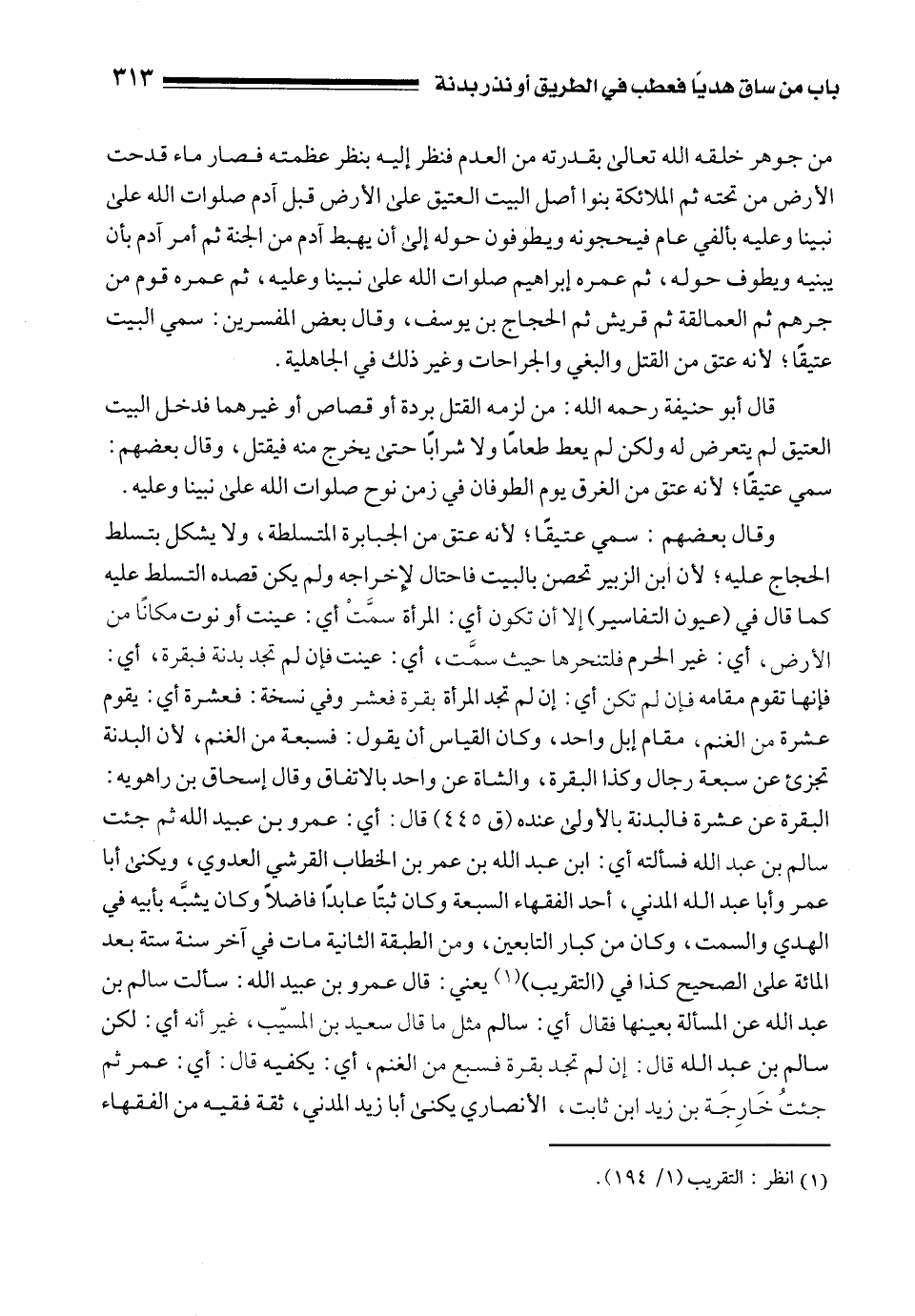 وقال بعضهم: سمي عتيقًا؛ لأنه عتق من الجبابرة المتسلطة، ولا يشكل بتسلط الحجاج عليه؛ لأن ابن الزبير تحصن بالبيت فاحتال لإخراجه ولم يكن قصده التسلط عليه كما قال في (عيون التفاسير) إلا أن تكون أي: المرأة سمَّتْ أي: عينت أو نوت مكانًا من الأرض، أي: غير الحرم فلتنحرها حيث سمَّت، أي: عينت فإن لم تجد بدنة فبقرة، أي: فإنها تقوم مقامه فإن لم تكن أي: إن لم تجد المرأة بقرة فعشر وفي نسخة: فعشرة أي: يقوم عشرة من الغنم، مقام إبل واحد، وكان القياس أن يقول: فسبعة من الغنم، لأن البدنة تجزئ عن سبعة رجال وكذا البقرة، والشاة عن واحد بالاتفاق وقال إسحاق بن راهويه: البقرة عن عشرة فالبدنة بالأولى عنده (ق 445) قال: أي: عمرو بن عبيد الله ثم جئت سالم بن عبد الله فسألته أي: ابن عبد الله بن عمر بن الخطاب القرشي العدوي، ويكنى أبا عمر وأبا عبد الله المدني، أحد الفقهاء السبعة وكان ثبتًا عابدًا فاضلًا وكان يشبَّه بأبيه في الهدي والسمت، وكان من كبار التابعين، ومن الطبقة الثانية مات في آخر سنة ستة بعد المائة على الصحيح كذا في (التقريب) (¬1) يعني: قال عمرو بن عبيد الله: سألت سالم بن عبد الله عن المسألة بعينها فقال أي: سالم مثل ما قال سعيد بن المسّيب، غير أنه أي: لكن سالم بن عبد الله قال: إن لم تجد بقرة فسبع من الغنم، أي: يكفيه قال: أي: عمر ثم جئتُ خَارِجَة بن زيد بن ثابت، الأنصاري يكنى أبا زيد المدني، ثقة فقيه من الفقهاء