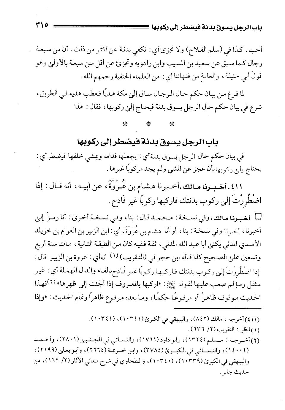 411 - أخبرنا مالك، أخبرنا هشام بن عُرْوَةَ، عن أبيه، أنه قال: إذا اضْطُرِرْتَ إلى ركوب بدنتك فاركبها ركوبًا غير فَادح.