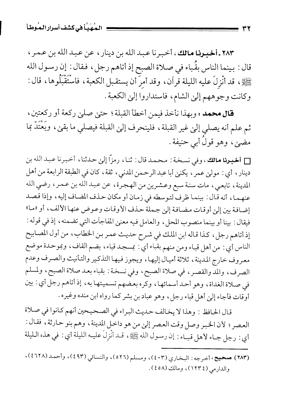 283 - أخبرنا مالك, أخبرنا عبد الله بن دينار، عن عبد الله بن عمر، قال: بينما الناس بقُباء في صلاة الصبح إذ أتاهم رجل، فقال: إن رسول الله - صلى الله عليه وسلم -، قد أُنْزِلَ عليه الليلة قرآن، وقد أُمِرَ أن يستقبل الكعبة، فاسْتَقْبَلُوها، قال: وكانت وجوههم إلى الشام، فاستداروا إلى الكعبة.