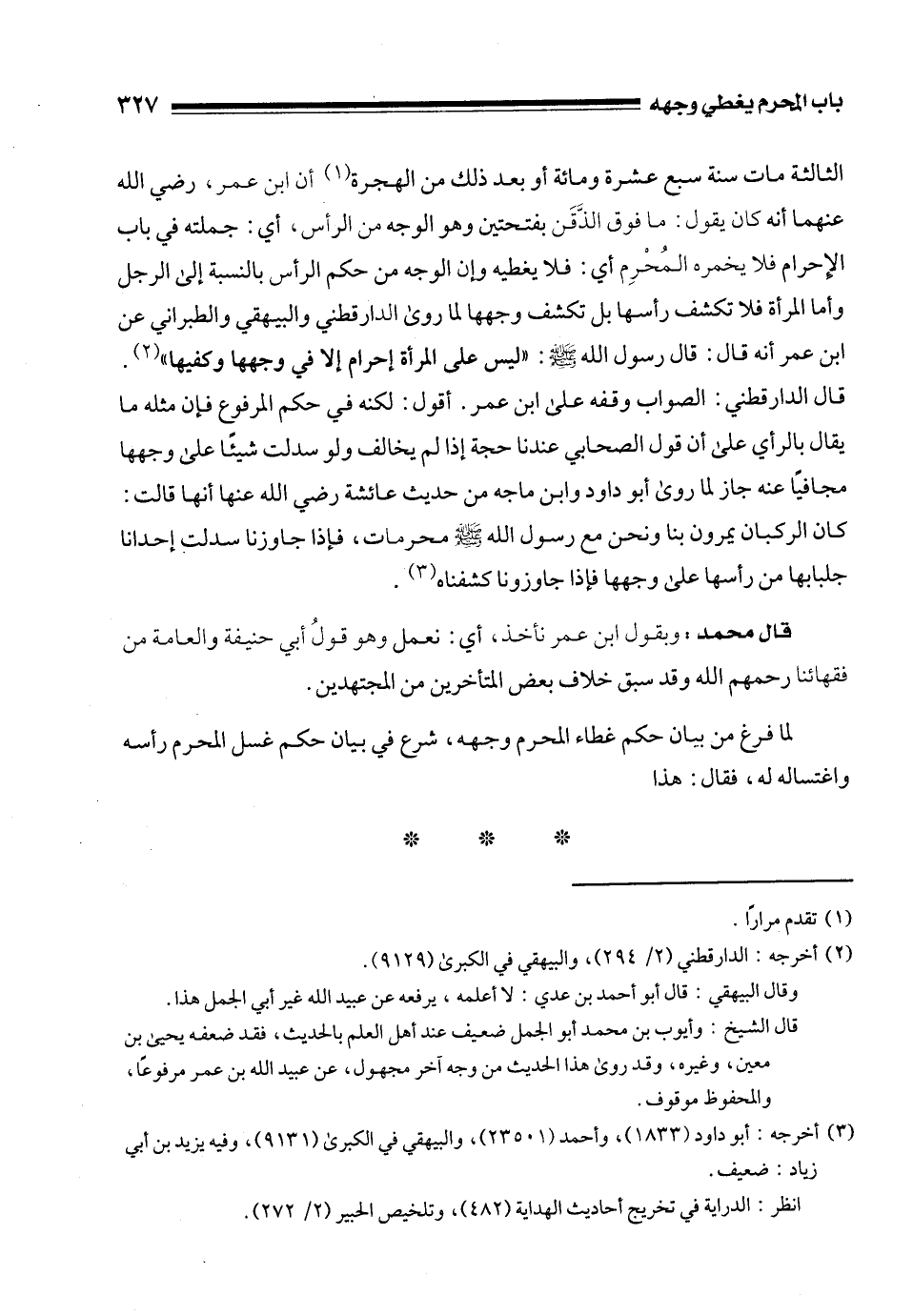 الثالثة مات سنة سبع عشرة ومائة أو بعد ذلك من الهجرة (¬1) أن ابن عمر، رضي الله عنهما أنه كان يقول: ما فوق الذَّقَن بفتحتين وهو الوجه من الرأس، أي: جملته في باب الإِحرام فلا يخمره المُحْرِم أي: فلا يغطيه وإن الوجه من حكم الرأس بالنسبة إلى الرجل وأما المرأة فلا تكشف رأسها بل تكشف وجهها لما روى الدارقطني والبيهقي والطبراني عن ابن عمر أنه قال: قال رسول الله - صلى الله عليه وسلم -: "ليس على المرأة إحرام إلا في وجهها وكفيها" (¬2).