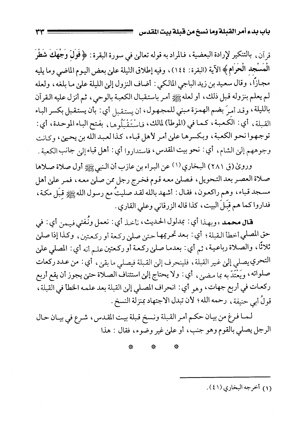 وروى (ق 281) البخاري (¬1) عن البراء بن عازب أن النبي - صلى الله عليه وسلم - أول صلاة صلاها صلاة العصر بعد التحويل، فصلى معه قوم فخرج رجل ممن صلى معه، فمر على أهل مسجد قباء، وهم راكعون، فقال: أشهد بالله لقد صليتُ مع رسول الله - صلى الله عليه وسلم - قِبَل مكة، فداروا كما هم قِبَلَ البيت، كذا قاله الزرقاني وعلي القاري.