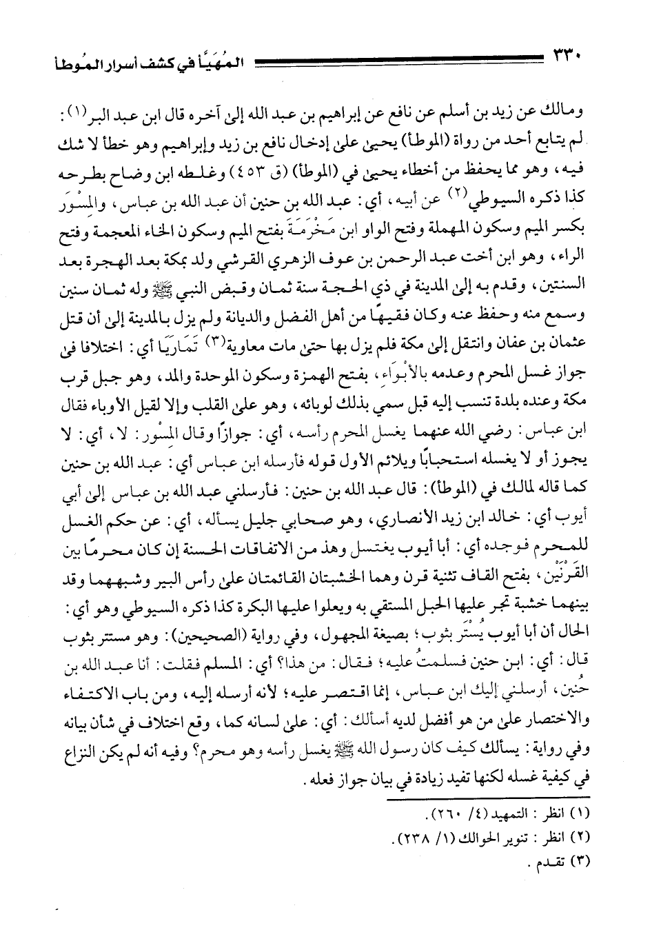 ومالك عن زيد بن أسلم عن نافع عن إبراهيم بن عبد الله إلى آخره قال ابن عبد البر (¬1): لم يتابع أحد من رواة (الموطأ) يحيى على إدخال نافع بن زيد وإبراهيم وهو خطأ لا شك فيه، وهو مما يحفظ من أخطاء يحيى في (الموطأ) (ق 453) وغلطه ابن وضاح بطرحه كذا ذكره السيوطي (¬2) عن أبيه، أي: عبد الله بن حنين أن عبد الله بن عباس، والمِسْوَر بكسر الميم وسكون المهملة وفتح الواو ابن مَخْرَمَةَ بفتح الميم وسكون الخاء المعجمة وفتح الراء، وهو ابن أخت عبد الرحمن بن عوف الزهري القرشي ولد بمكة بعد الهجرة بعد السنتين، وقدم به إلى المدينة في ذي الحجة سنة ثمان وقبض النبي - صلى الله عليه وسلم - وله ثمان سنين وسمع منه وحفظ عنه وكان فقيهًا من أهل الفضل والديانة ولم يزل بالمدينة إلى أن قتل عثمان بن عفان وانتقل إلى مكة فلم يزل بها حتى مات معاوية (¬3) تَمَارَيَا أي: اختلافا في جواز غسل المحرم وعدمه بالأبْوَاءِ، بفتح الهمزة وسكون الموحدة والمد، وهو جبل قرب مكة وعنده بلدة تنسب إليه قبل سمي بذلك لوبائه، وهو على القلب وإلا لقيل الأوباء فقال ابن عباس: رضي الله عنهما يغسل الحرم رأسه، أي: جوازًا وقال المِسْور: لا، أي: لا يجوز أو لا يغسله استحبابًا ويلائم الأول قوله فأرسله ابن عباس أي: عبد الله بن حنين كما قاله لمالك في (الموطأ): قال عبد الله بن حنين: فأرسلني عبد الله بن عباس إلى أبي أيوب أي: خالد بن زيد الأنصاري، وهو صحابي جليل يسأله، أي: عن حكم الغسل للمحرم فوجده أي: أبا أيوب يغتسل وهذا من الاتفاقات الحسنة إن كان محرمًا بين القَرْنَيْن، بفتح القاف تثنية قرن وهما الخشبتان القائمتان على رأس البير وشبههما وقد بينهما خشبة تجر عليها الحبل المستقي به ويعلوا عليها البكرة كذا ذكره السيوطي وهو أي: الحال أن أبا أيوب يُسْتَر بثوب؛ بصيغة المجهول، وفي رواية (الصحيحين): وهو مستتر بثوب قال: أي: ابن حنين فسلمتُ عليه؛ فقال: من هذا؟ أي: المسلم فقلت: أنا عبد الله بن حُنين، أرسلني إليك ابن عباس، إنما اقتصر عليه؛ لأنه أرسله إليه، ومن باب الاكتفاء والاختصار على من هو أفضل لديه أسألك: أي: على لسانه كما، وقع اختلاف في شأن بيانه وفي رواية: يسألك كيف كان رسول الله - صلى الله عليه وسلم - يغسل رأسه وهو محرم؟ وفيه أنه لم يكن النزاع في كيفية غسله لكنها تفيد زيادة في بيان جواز فعله.