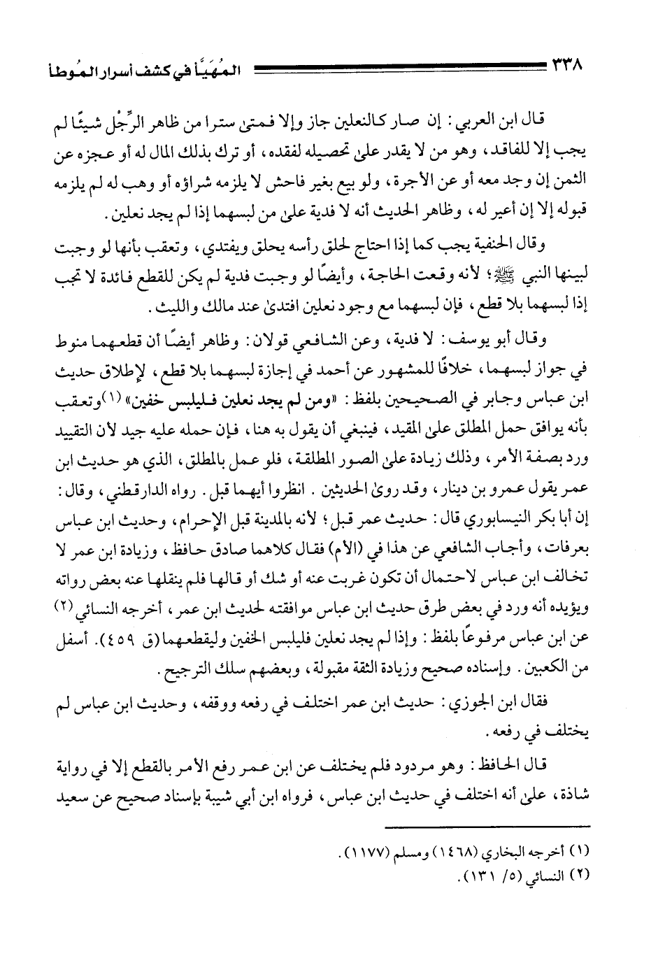 وقال أبو يوسف: لا فدية، وعن الشافعي قولان: وظاهر أيضًا أن قطعهما منوط في جواز لبسهما، خلافًا للمشهور عن أحمد في إجازة لبسهما بلا قطع، لإِطلاق حديث ابن عباس وجابر في الصحيحين بلفظ: "ومن لم يجد نعلين فليلبس خفين" (¬1) وتعقب بأنه يوافق حمل المطلق على المقيد، فينبغي أن يقول به هنا، فإن حمله عليه جيد لأن التقييد ورد بصفة الأمر، وذلك زيادة على الصور المطلقة، فلو عمل بالمطلق، الذي هو حديث ابن عمر يقول عمرو بن دينار، وقد روى الحديثين. انظروا أيهما قبل. رواه الدارقطني، وقال: إن أبا بكر النيسابوري قال: حديث عمر قبل؛ لأنه بالمدينة قبل الإِحرام، وحديث ابن عباس بعرفات، وأجاب الشافعي عن هذا في (الأم) فقال كلاهما صادق حافظ، وزيادة ابن عمر لا تخالف ابن عباس لاحتمال أن تكون غربت عنه أو شك أو قالها فلم ينقلها عنه بعض رواته ويؤيده أنه ورد في بعض طرق حديث ابن عباس موافقته لحديث ابن عمر، أخرجه النسائي (¬2) عن ابن عباس مرفوعًا بلفظ: وإذا لم يجد نعلين فليلبس الخفين وليقطعهما (ق 459). أسفل من الكعبين. وإسناده صحيح وزيادة الثقة مقبولة، وبعضهم سلك الترجيح.