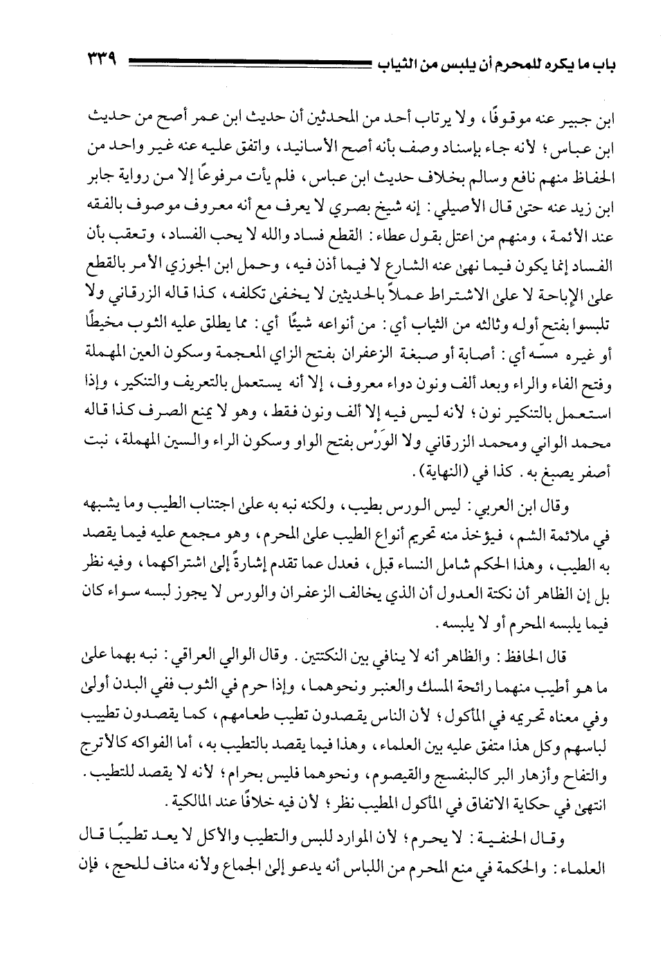 وقال ابن العربي: ليس الورس بطيب، ولكنه نبه به على اجتناب الطيب وما يشبهه في ملائمة الشم، فيؤخذ منه تحريم أنواع الطيب على المحرم، وهو مجمع عليه فيما يقصد به الطيب، وهذا الحكم شامل النساء قبل، فعدل عما تقدم إشارةً إلى اشتراكهما، وفيه نظر بل إن الظاهر أن نكتة العدول أن الذي يخالف الزعفران والورس لا يجوز لبسه سواء كان فيما يلبسه المحرم أو لا يلبسه.