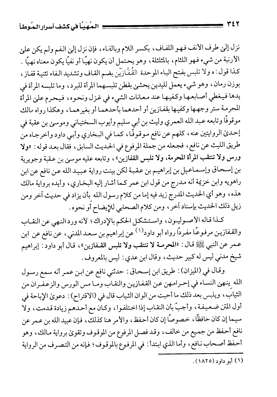 نزل إلى طرف الأنف فهو اللفاف، بكسر اللام وبالفاء، فإن نزل إلى الفم ولم يكن على الأرنبة من شيء فهو اللثام، بالمثلثة، وهو يحتمل أن يكون نهيًا أو نفيًا يكون معناه نهيًا. كذا قوله: ولا تلبس بفتح الباء الموحدة القُفَّازَيْن بضم القاف وتشديد الفاء تثنية قفاز، بوزن رمان، وهو شيء يعمل لليدين يحشى بقطن تلبسهما المرأة للبرد، وما تلبسه المرأة في يدها فيغطي أصابعها وكفيها عند معانات الشيء في غزل ونحوه، فيحرم على المرأة المحرمة ستر وجهها وكفيها بقفازين أو أحدهما بأحدهما أو بغيرهما، وهكذا رواه مالك موقوفًا وتابعه عبد الله العمري وليث بن أبي سليم وأيوب السختياني وموسى بن عقبة في إحدى الروايتين عنه، كلهم عن نافع موقوفًا، كما في البخاري وأبي داود وأخرجاه من طريق الليث عن نافع، فجعله من جملة المرفوع في الحديث السابق، فقال بعد قوله: "ولا ورس ولا تنتقب المرأة المحرمة، ولا تلبس القفازين"، وتابعه عليه موسى بن عقبة وجويرية بن إسحاق وإسماعيل بن إبراهيم بن عقبة لكن بينت رواية عبيد الله عن نافع عن ابن راهويه وابن خزيمة أنه مدرج من قول ابن عمر كما أشار إليه البخاري، وأيده برواية مالك هذه، وهو أي الحديث المدرج زيد فيه إما من كلام رسول الله بأن يزاد في حديث آخر ومن زيل ذلك الحديث بإسناد آخر، ومن كلام الصحابي للإِيضاح أَو نحوه.