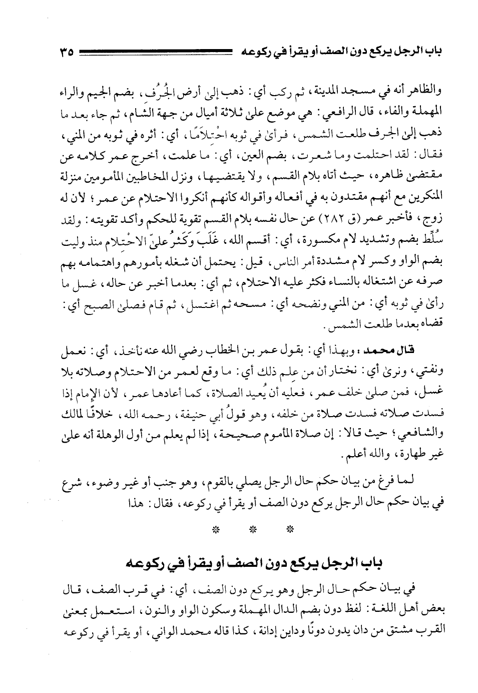 والظاهر أنه في مسجد المدينة، ثم ركب أي: ذهب إلى أرض الجُرُفِ، بضم الجيم والراء المهملة والفاء، قال الرافعي: هي موضع على ثلاثة أميال من جهة الشام، ثم جاء بعد ما ذهب إلى الجرف طلعت الشمس، فرأى في ثوبه احْتِلَامًا، أي: أثره في ثوبه من المني، فقال: لقد احتلمت وما شعرت، بضم العين، أى: ما علمت، أخرج عمر كلامه عن مقتضى ظاهره، حيث أتاه بلام القسم، ولا يقتضيها، ونزل المخاطبين المأمومين منزلة المنكرين مع أنهم مقتدون به في أفعاله وأقواله كأنهم أنكروا الاحتلام عن عمر؛ لأن له زوج، فأخبر عمر (ق 282) عن حال نفسه بلام القسم تقوية للحكم وأكد تقويته: ولقد سُلِّط بضم وتشديد لام مكسورة، أي: أقسم الله، غَلَبَ وَكَثرُ علىّ الاحْتِلام منذ وليت بضم الواو وكسر لام مشددة أمر الناس، قيل: يحتمل أن شغله بأمورهم واهتمامه بهم صرفه عن اشتغاله بالنساء فكثر عليه الاحتلام، ثم أي: بعد ما أخبر عن حاله، غسل ما رأى في ثوبه أي: من المني ونضحه أي: مسحه ثم اغتسل، ثم قام فصلى الصبح أي: قضاه بعد ما طلعت الشمس.