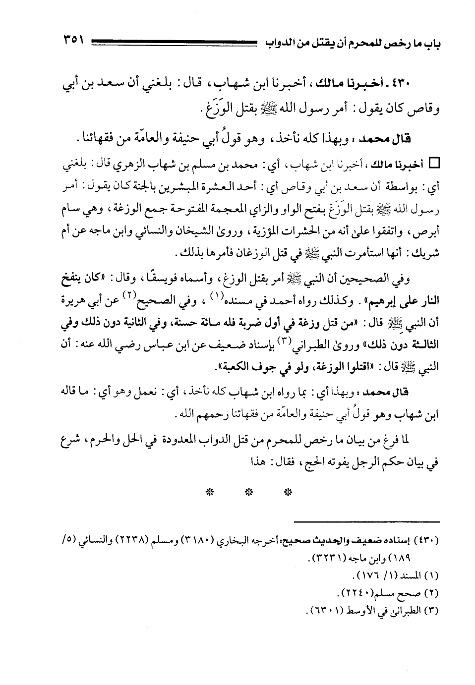 قال محمد: وبهذا أي: بما رواه ابن شهاب كله نأخذ، أي: نعمل وهو أي: ما قاله ابن شهاب وهو قولُ أبي حنيفة والعامّة من فقهائنا رحمهم الله.