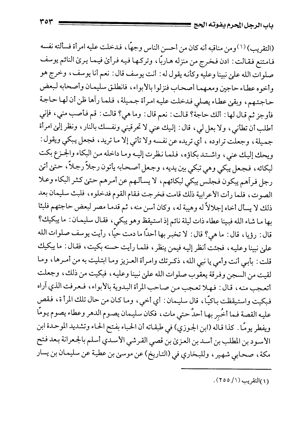 (التقريب) (¬1) ومن مناقبه أنه كان من أحسن الناس وجهًا، فدخلت عليه امرأة فسألته نفسه فامتنع فقالت: ادن فخرج من منزله هاربًا، وتركها فيه فرأى فيما يرى النائم يوسف صلوات الله على نبينا وعليه وكأنه يقول له: أنت يوسف قال: نعم أنا يوسف، وخرج هو وأخوه عطاء حاجين ومعهما أصحاب فنزلوا بالأبواء، فانطلق سليمان وأصحابه لبعض حاجتهم، وبقى عطاء يصلي فدخلت عليه امرأة جميلة، فلما رآها ظن أن لها حاجة فأوجز ثم قال لها: ألك حاجة؟ قالت: نعم قال: وما هي؟ قالت: قم فأصب مني، فإني أطلب أن تطأني، ولا بعل لي، قال: إليك عني لا تحرقيني ونفسك بالنار، ونظر إلى امرأة جميلة، وجعلت تراوده، أي تريده عن نفسه ولا تأتي إلا ما تريد، فجعل يبكي ويقول: ويحك إليك عني، واشتد بكاؤه، فلما نظرت إليه وما داخله من البكاء والجزع بكت لبكائه، فجعل يبكي وهي تبكي بين يديه، وجعل أصحابه يأتون رجلًا رجلًا، حتى أتى رجل فرآهم يبكون فجلس يبكي لبكائهم، لا يسألهم عن أمرهم حتى كثر البكاء وعلا الصوت، فلما رأت الأعرابية ذلك قامت فخرجت فقام القوم فدخلوه، فلبث سليمان بعد ذلك لا يسأل أخاه إجلالًا له وهيبة له، وكان أسن منه، ثم قدما مصر لبعض حاجتهم فلبثا بها ما شاء الله فبينا عطاء ذات ليلة نائم إذ استيقظ وهو يبكي، فقال سليمان: ما يبكيك؟ قال: رؤيا، قال: ما هي؟ قال: لا تخبر بها أحدًا ما دمت حيًا، رأيت يوسف صلوات الله على نبينا وعليه، فجئت أنظر إليه فيمن ينظر، فلما رأيت حسنه بكيت، فقال: ما يبكيك قلت: بأبي أنت وأمي يا نبي الله، ذكرتك وامرأة العزيز وما ابتليت به من أمرها، وما لقيت من السجن وفرقة يعقوب صلوات الله على نبينا وعليه، فبكيت من ذلك، وجعلت أتعجب منه، قال: فهلا تعجب من صاحب المرأة البدوية بالأبواء، فعرفت الذي آراه فبكيت واستيقظت باكيًا، قال سليمان: أي أخي، وما كان من حالى تلك المرأة، فقص عليه القصة فما أُخبِر بها أحدٌ حتى مات، فكان سليمان يصوم الدهر وعطاء يصوم يومًا ويفطر يومًا. كذا قاله (ابن الجوزي) في طبقاته أن الحباء بفتح الحاء وتشديد الموحدة ابن الأسود بن المطلب بن أسد بن العزى بن قصي القرشي الأسدي أسلم بالجعرانة بعد فتح مكة، صحابي شهير، وللبخاري في (التاريخ) عن موسى بن عطية عن سليمان بن يسار