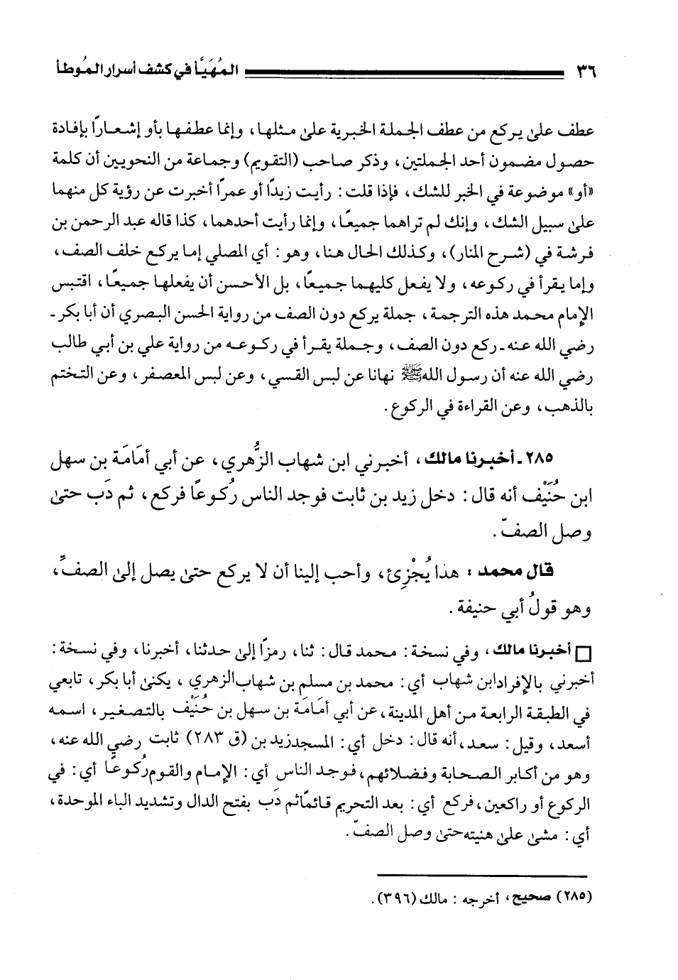 285 - أخبرنا مالك، أخبرني ابن شهاب الزُّهري، عن أبي أمَامَة بن سهل بن حُنَيْف أنه قال: دخل زيد بن ثابت فوجد الناس رُكوعًا فركع، ثم دَب حتى وصل الصفّ.