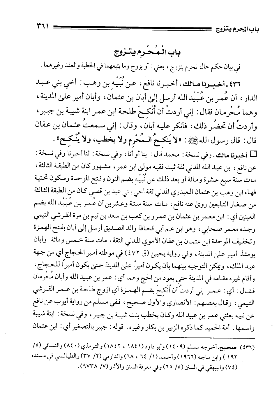 436 - أخبرنا مالك، أخبرنا نافع، عن نُبَيْهِ بن وهب: أخي بني عبد الدار، أن عُمر بن عُبَيْد الله أرسل إلى أبان بن عثمان، وأبان أمير على المدينة، وهما مُحْرمان فقال: إني أردتُ أن أُنْكِحَ طلحة ابن عمر ابنة شيبة بن جبير، وأردتُ أن تحضُر ذلك، فأنكر عليه أبان، وقال: إني سمعتُ عثمان بن عفان قال: قال رسول الله - صلى الله عليه وسلم -: "لا يَنكِحُ المُحْرِم ولا يخطب، ولا يُنْكِح".
